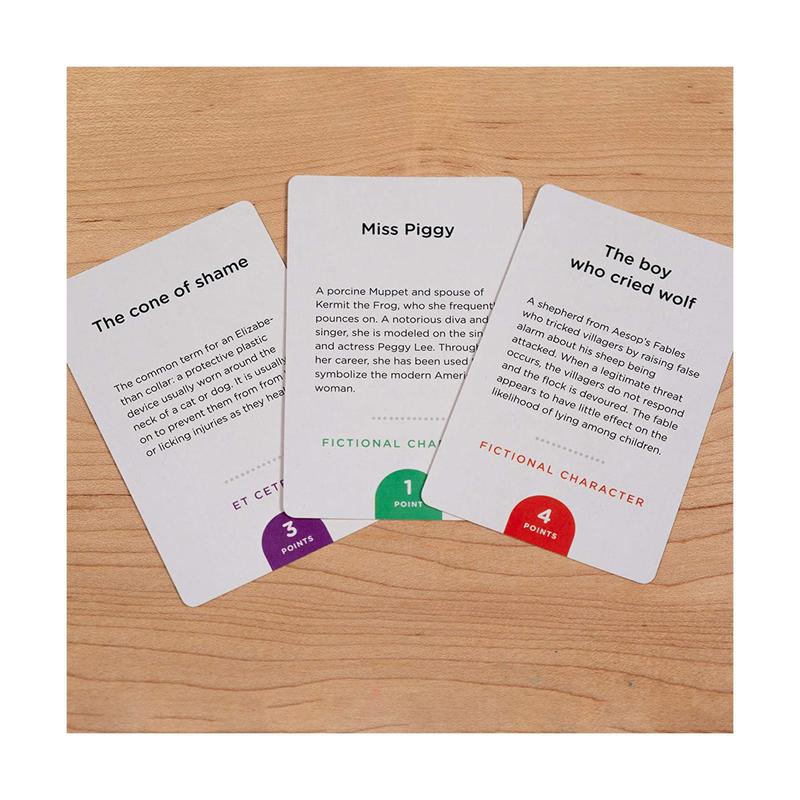 In the first round, you can say anything you want, except the name itself. In Round 2, you can only use one word to hint at the name. And in Round 3, you can't say anything at all - only perform charades to get your team to guess the name. The same cards get shuffled, but don't change between rounds, so by the end of the game, you and your friends will have all made up a bunch of hilarious jokes together.