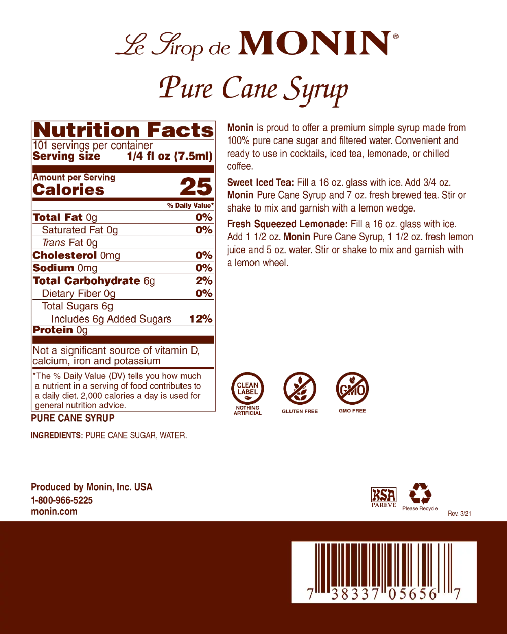 Monin is proud to offer Pure Cane Syrup; a premium simple syrup made with 100% American pure cane sugar and filtered water. Made with premium ingredients, Pure Cane Syrup is specially formulated to dissolve instantly in any hot or cold beverage, for fast convenient use with great taste.