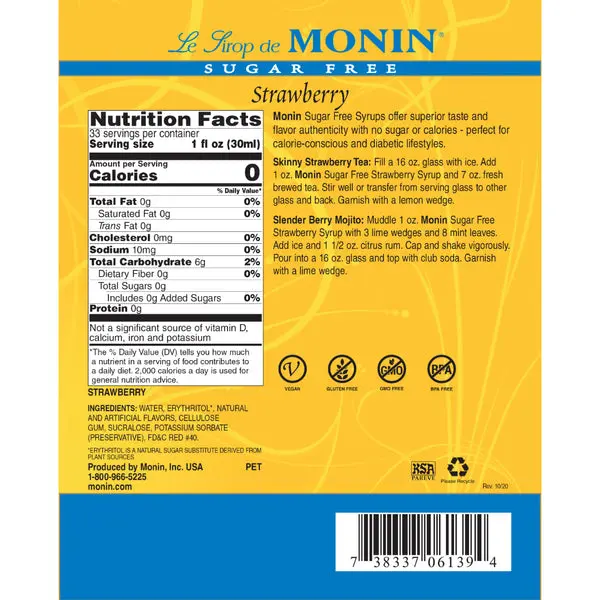 Monin Sugar Free Strawberry Syrup brings a touch of guilt-free sweetness and bold flavor to smoothies, handcrafted sodas, skinny cocktails, mocktails and more. Our Sugar Free Strawberry Syrup bottles their celebrated sweetness for your favorite cocktails, mocktails, sodas and teas without added sugar or calories.