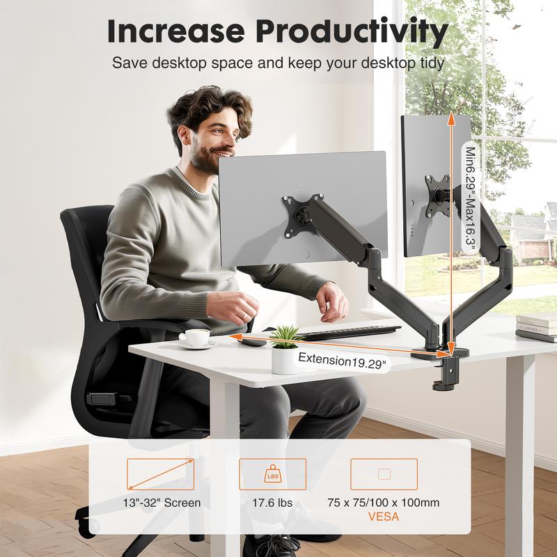 ăMaximize Desktop SpaceăCompared to a monitor stand with a base, our stand frees up more than 80% of the desktop space for office supplies, creating a more comfortable and tidy working environment. The monitor arm provides two desktop mounting methods: C-Clamp and hole seat, you can choose the installation method according to your own use.