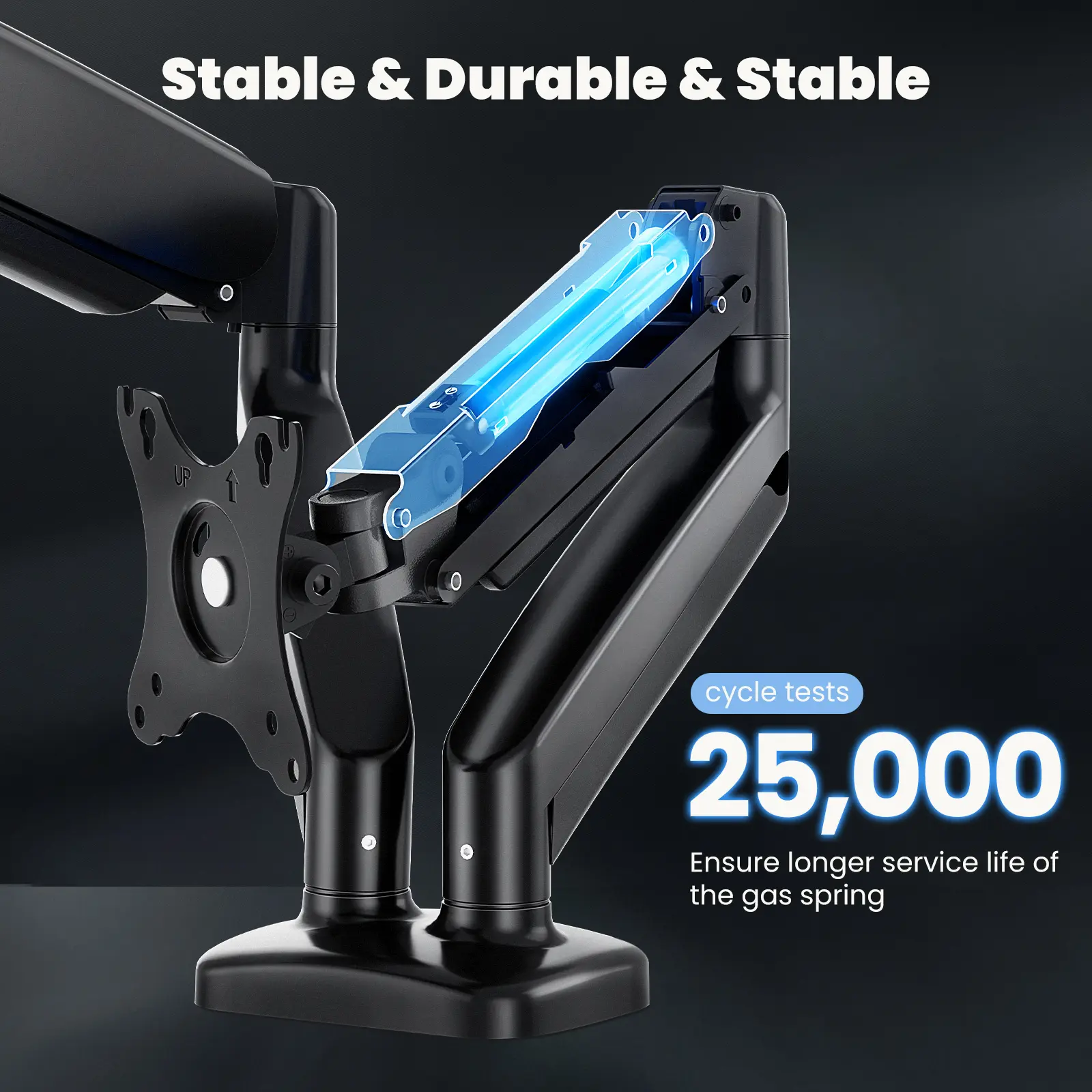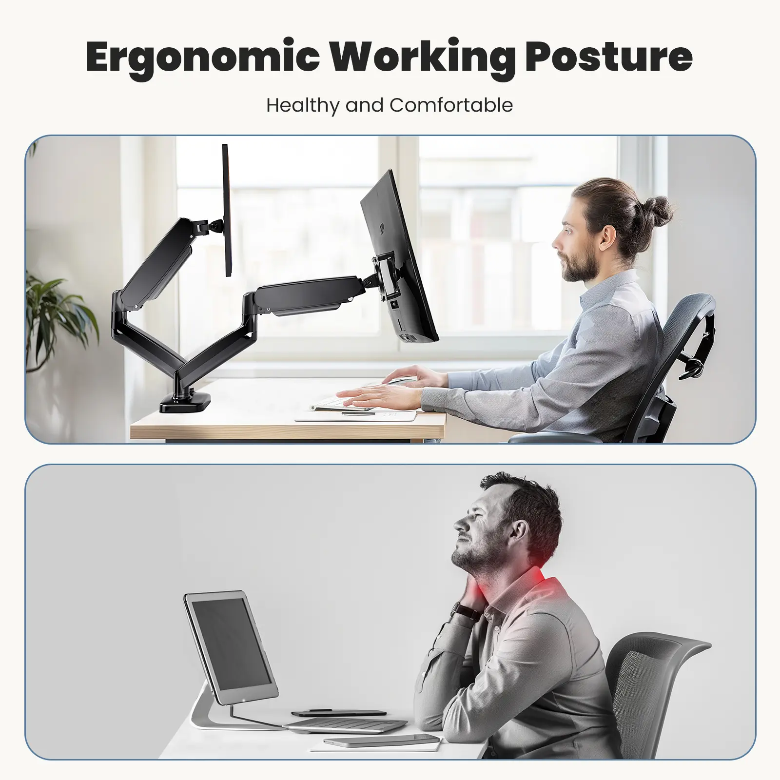 【Multi-directional Flexible Adjustment】By Adjusting the tension of the spring to smoothly extend the display 19.3 inches outward, and the stand arm can be raised 16.3 inches above the desktop to customize your viewing angle,while supporting screen rotates 360°for landscape or portrait orientation, swivels 180°to share your monitor, and tilts up 90°/down 45° for better viewing. (Tilt:-45°/+90°, Swivel:180°, Rotate:360°)