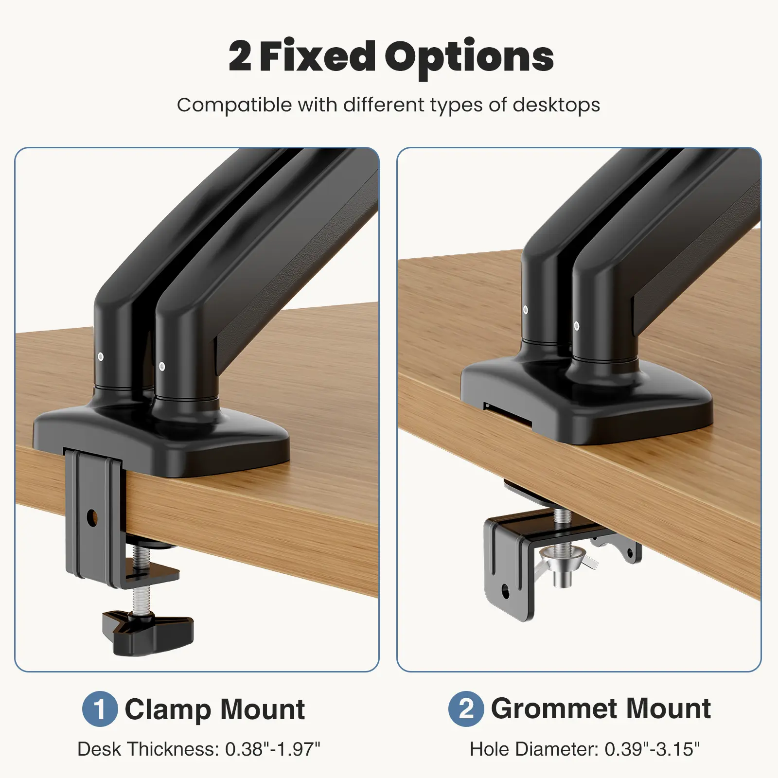 【Maximize Desktop Space】Compared to a monitor stand with a base, our stand frees up more than 80% of the desktop space for office supplies, creating a more comfortable and tidy working environment. The monitor arm provides two desktop mounting methods: C-Clamp and hole seat, you can choose the installation method according to your own use. Both ways can be stably and securely fixed to the desktop regardless of whether the desktop has holes.