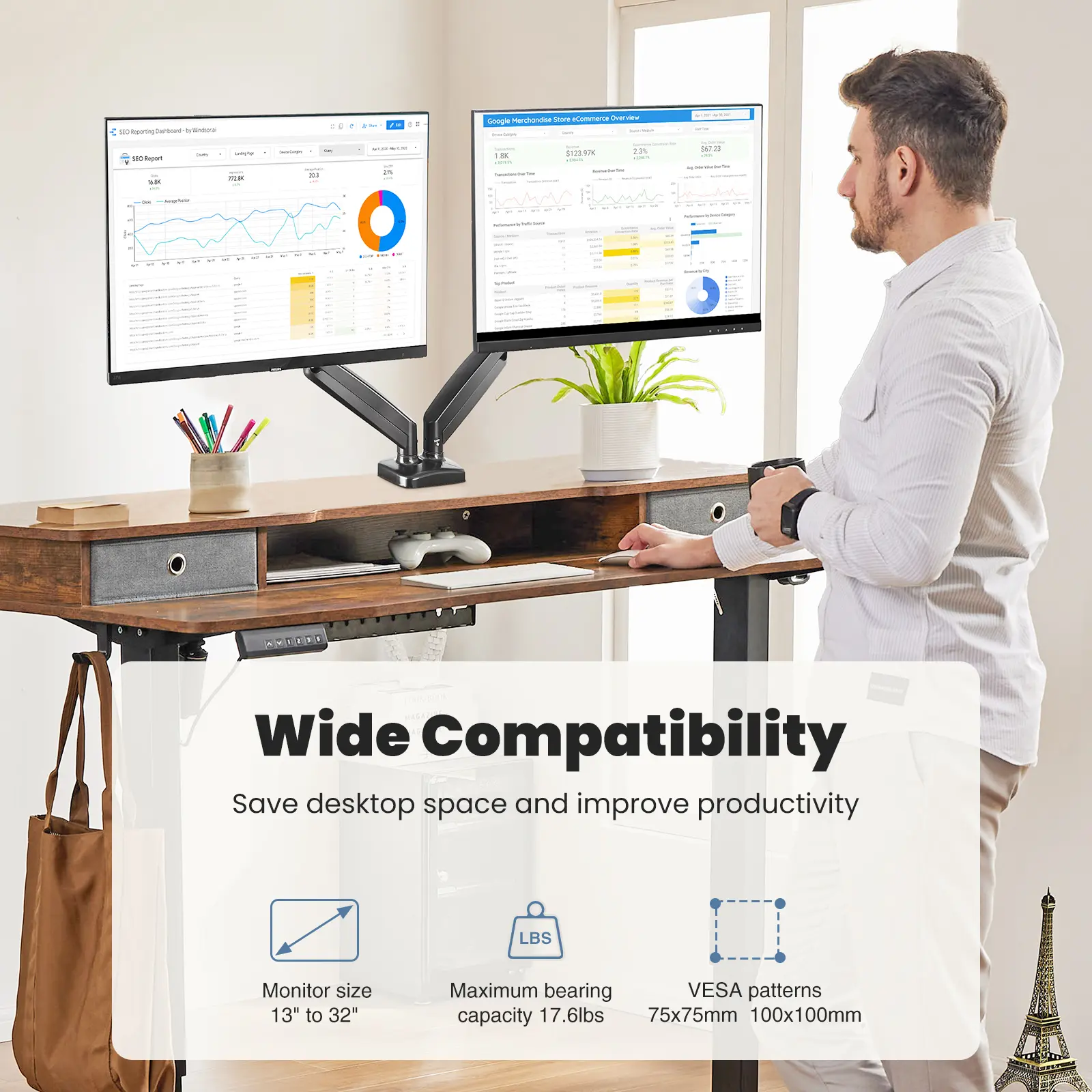 【Compatible with Desk & Monitor】Single monitor mount arm can fit 13 to 32 Inch screen and hold 17.6lbs with 75x75/100x100 VESA pattern, maximum compatibility with fixed desktop thickness from 0.39 inches to 2.36/3.96 inches to fit your monitors and desks. The monitor stand expands the range of vision and improves sitting posture,and you can stand or sit at work, increasing productivity.