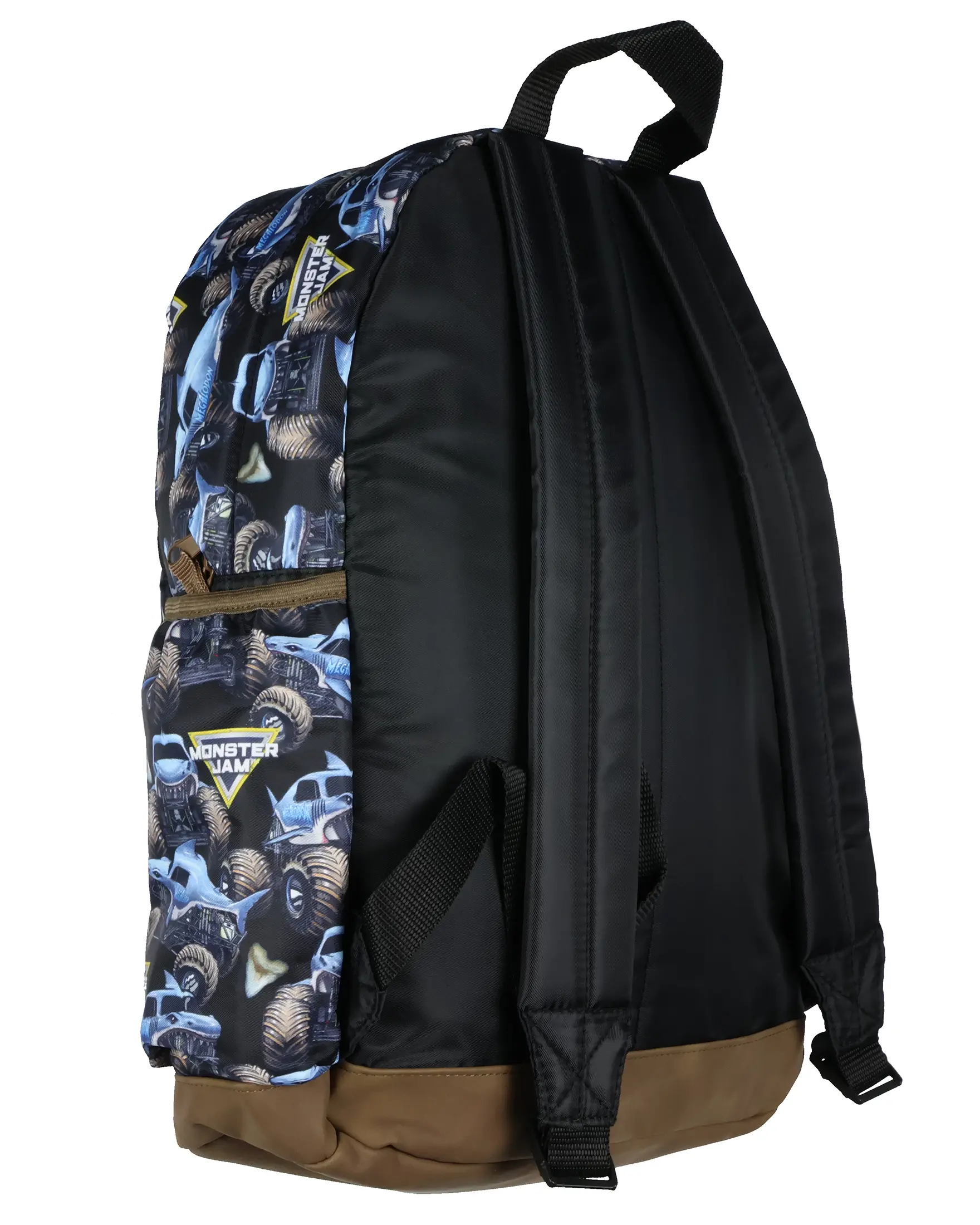 Unleash the power of the Megalodon with this Monster Jam backpack! Designed for those who need style and functionality, this bag features an allover Megalodon shark design that will make an impression. The spacious main compartment and padded laptop sleeve ensure your gear is organized and protected, while the smaller front zipper pocket offers extra storage for essentials like pens, keys, or a phone. The padded adjustable straps provide a perfect fit for long days of use. Side mesh pockets allow easy access to your water bottle or snacks, while the top hanging loop adds convenience when storing it. Whether packing for school, a road trip, or running errands, this versatile backpack has you covered. This backpack measures 16" x 12" x 4" Officially Licensed Product Multi-Functional Storage: Keep everything organized with a spacious main compartment and a dedicated laptop sleeve to store your tech safely. Plus, a front zipper pocket for smaller items and two side mesh pockets for easy access to your water bottle or snacks Comfortable & Adjustable Fit: Designed with padded, adjustable straps that provide comfort for all-day wear, making this backpack the ideal companion for school, travel, or weekend adventures Built for Durability: Whether carrying books, snacks, or tech, this backpack is made to withstand daily use. The durable materials ensure your gear is protected, while the top hanging loop makes it easy to store. This backpack measures 16" x 12" x 4" Versatile and Practical: This backpack offers both style and functionality. Whether you're headed to school, a sports event, or just out on the go, it's designed to meet all your storage needs. Recommended for ages three and up