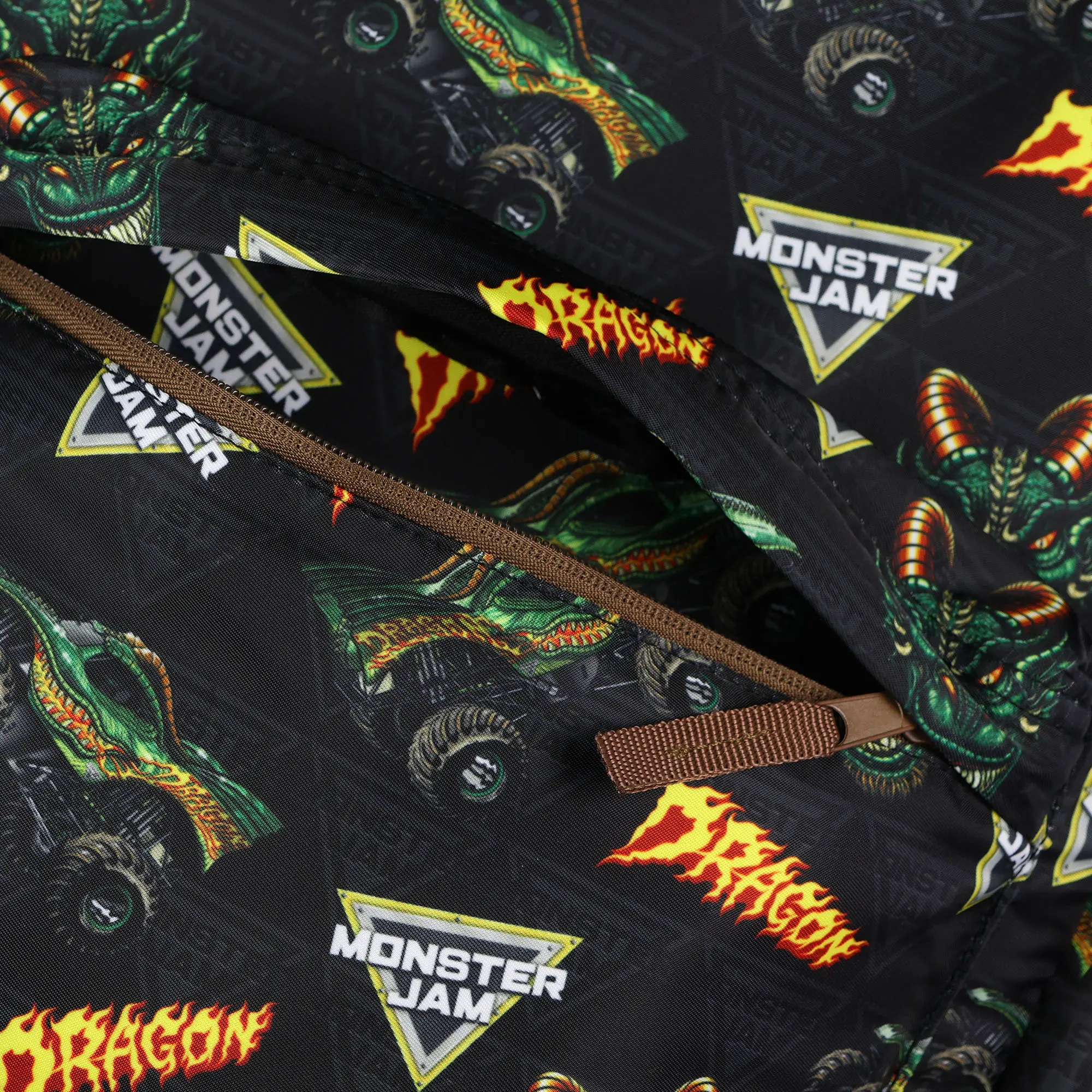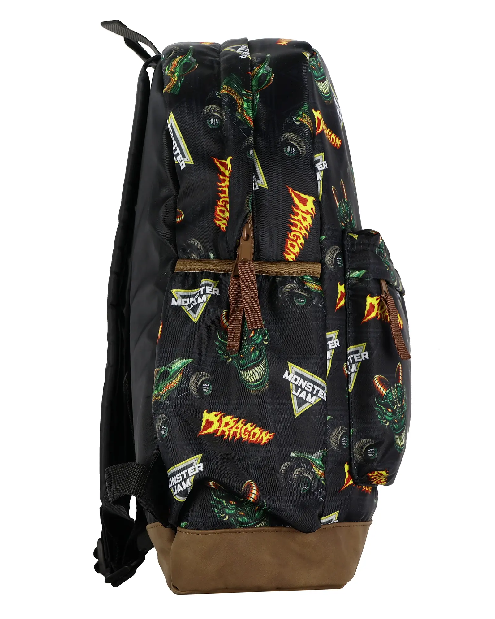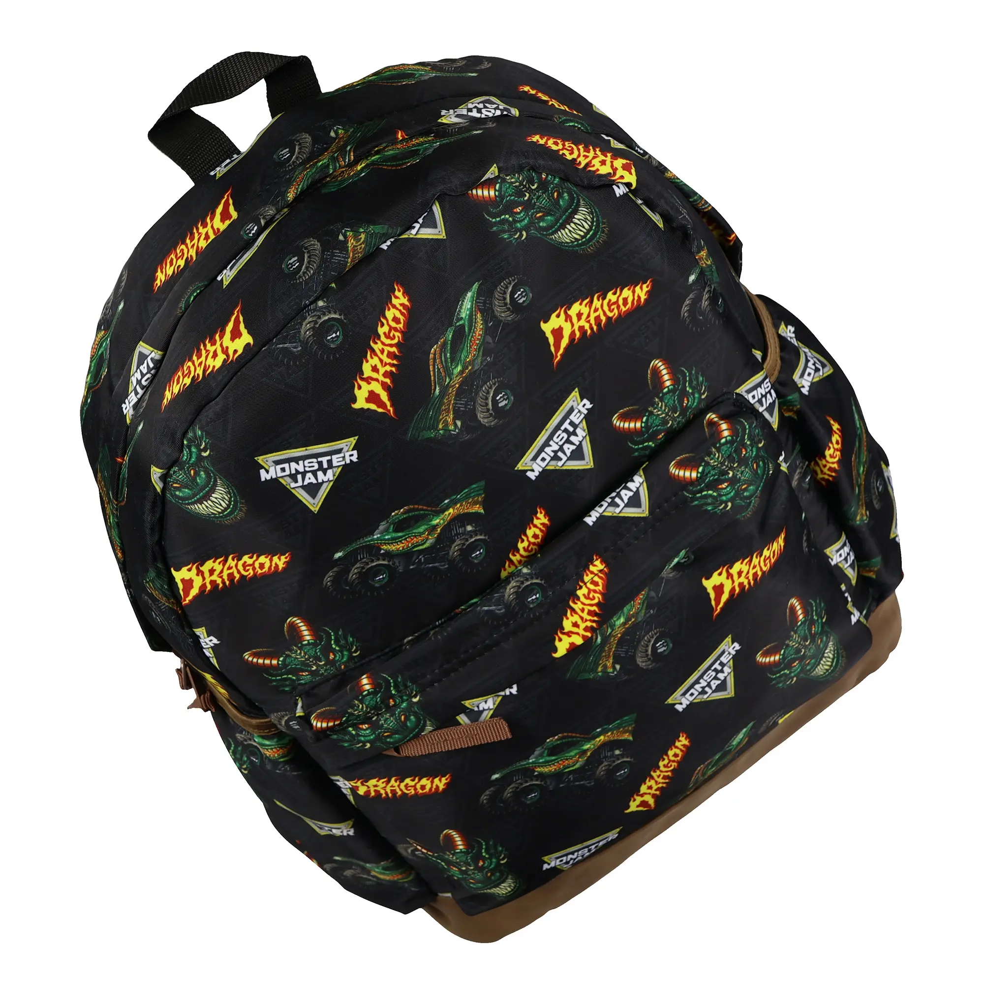 The backpack features a large main compartment with a lightly padded tech sleeve for tablets, small laptops, or notebooks, plus a smaller front pocket and two side pockets for bottles and other essentials. Adjustable padded shoulder straps and a top handle provide comfortable carrying, while the sturdy construction and wipe-clean fabric make it practical and long-lasting for daily use. Backpack measures 16" x 11" x 5" with front lower compartment measuring approx. 9.5" x 7" x1". Striking Dragon Design: The backpack features an all-over Dragon monster truck print, including the yellow Monster Jam logo, Dragon logo, face, and truck, set against a black background with subtle gray Monster Jam logos for a bold, standout look. Zippers and the bottom of the bag are brown, providing a complementary accent. Spacious Main Compartment: Includes a large zippered compartment with a lightly padded tech sleeve, suitable for tablets, small laptops, or notebooks. This compartment keeps essentials organized and secure while providing easy access to larger items. Backpack measures 16" x 11" x 5", with a front lower compartment measuring approx. 9.5" x 7" x 1". Convenient Carry Features: Equipped with a reinforced top hanging loop and two side pockets, ideal for water bottles, snacks, and other small essentials. The design keeps items easily accessible without opening the main compartment. Adjustable Padded Straps: Shoulder straps are fully adjustable and padded for comfort, providing a customized fit. They reduce shoulder pressure and offer ergonomic support for daily use or extended wear. Durable Construction & Easy Cleaning: Made from 100% polyester, the bag is built to withstand everyday wear and tear. The smooth fabric makes for easy wipe-clean maintenance, keeping the backpack looking neat and ready for use.