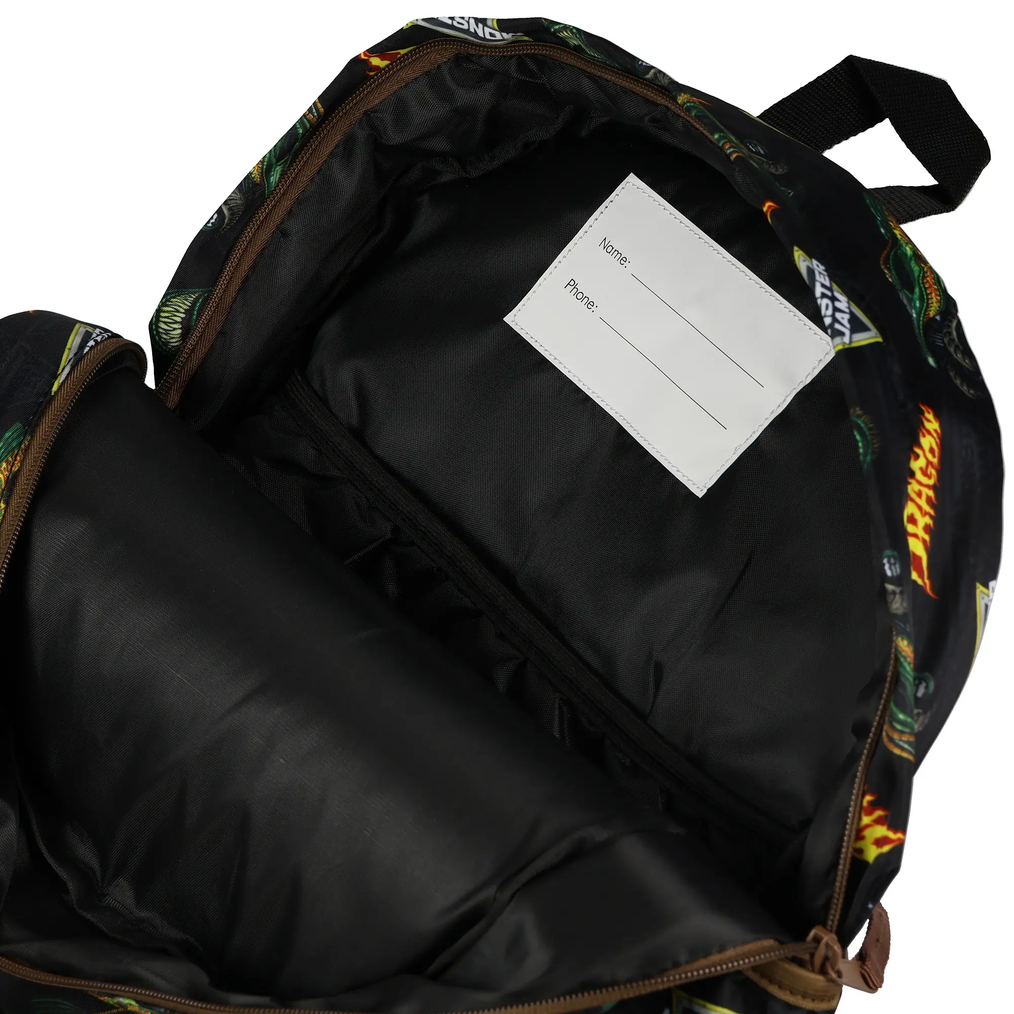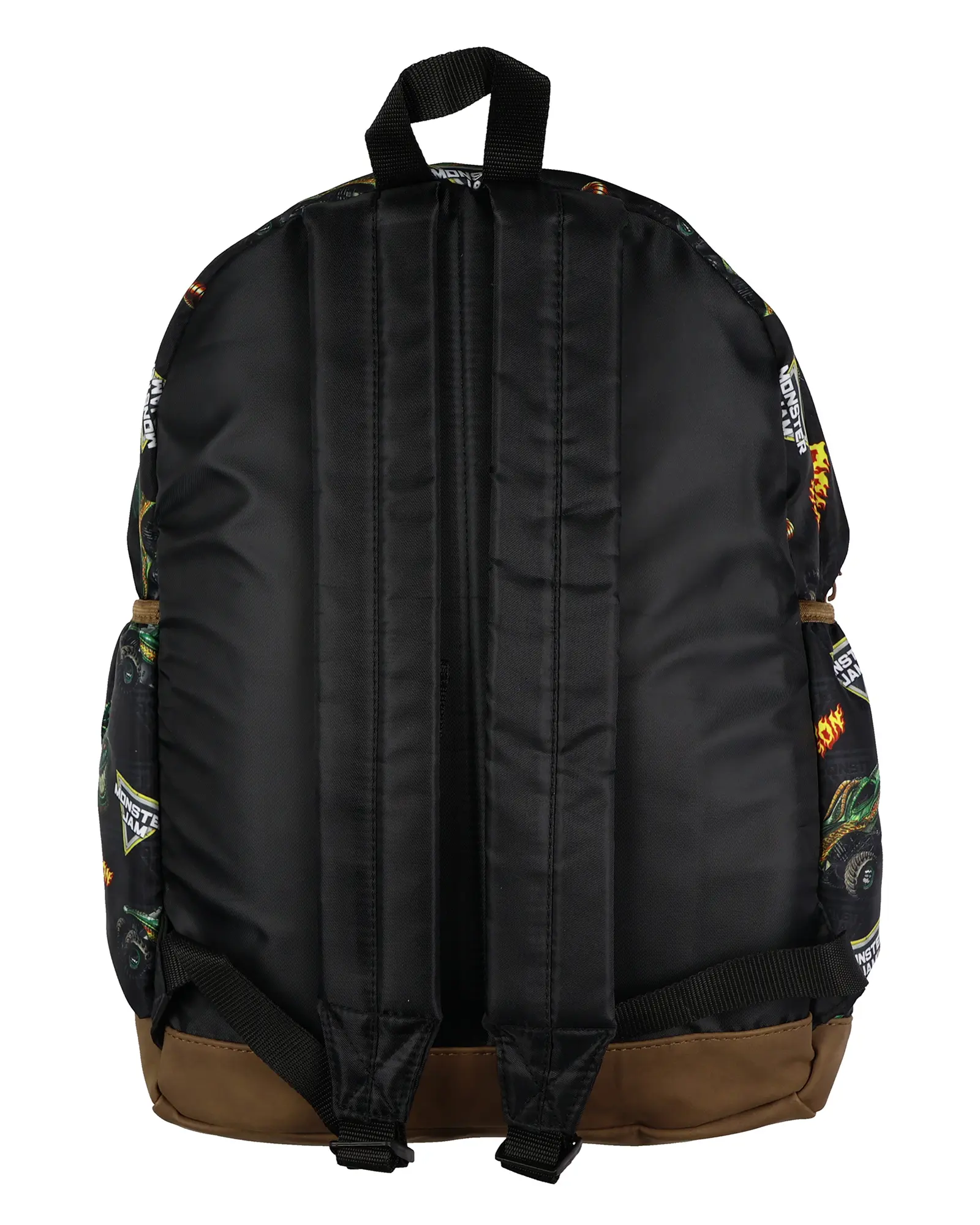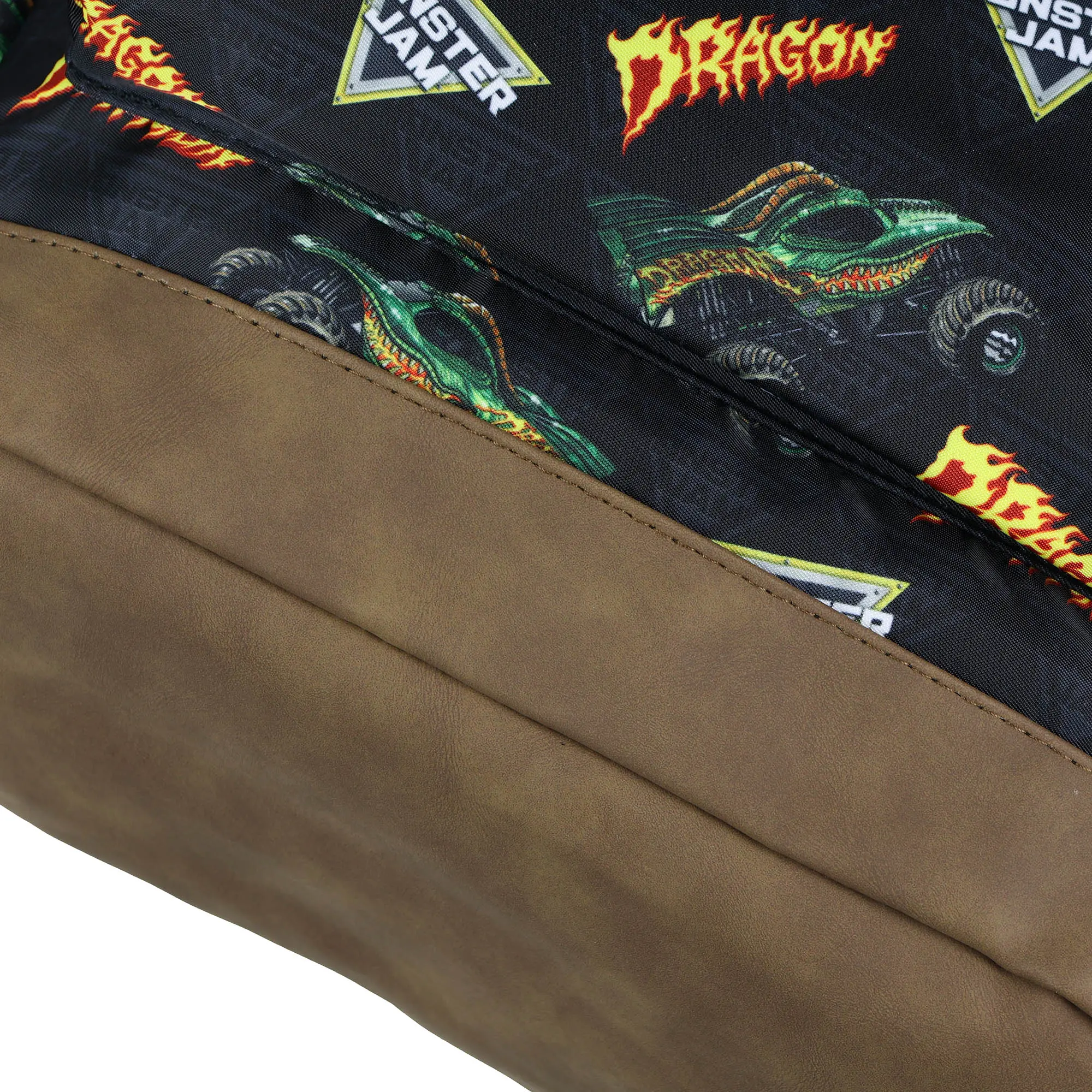 The backpack features a large main compartment with a lightly padded tech sleeve for tablets, small laptops, or notebooks, plus a smaller front pocket and two side pockets for bottles and other essentials. Adjustable padded shoulder straps and a top handle provide comfortable carrying, while the sturdy construction and wipe-clean fabric make it practical and long-lasting for daily use. Backpack measures 16" x 11" x 5" with front lower compartment measuring approx. 9.5" x 7" x1". Striking Dragon Design: The backpack features an all-over Dragon monster truck print, including the yellow Monster Jam logo, Dragon logo, face, and truck, set against a black background with subtle gray Monster Jam logos for a bold, standout look. Zippers and the bottom of the bag are brown, providing a complementary accent. Spacious Main Compartment: Includes a large zippered compartment with a lightly padded tech sleeve, suitable for tablets, small laptops, or notebooks. This compartment keeps essentials organized and secure while providing easy access to larger items. Backpack measures 16" x 11" x 5", with a front lower compartment measuring approx. 9.5" x 7" x 1". Convenient Carry Features: Equipped with a reinforced top hanging loop and two side pockets, ideal for water bottles, snacks, and other small essentials. The design keeps items easily accessible without opening the main compartment. Adjustable Padded Straps: Shoulder straps are fully adjustable and padded for comfort, providing a customized fit. They reduce shoulder pressure and offer ergonomic support for daily use or extended wear. Durable Construction & Easy Cleaning: Made from 100% polyester, the bag is built to withstand everyday wear and tear. The smooth fabric makes for easy wipe-clean maintenance, keeping the backpack looking neat and ready for use.