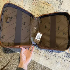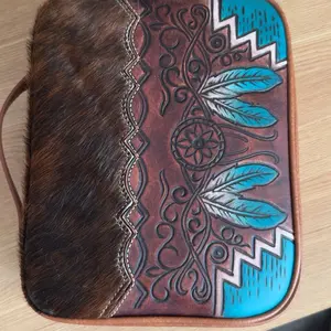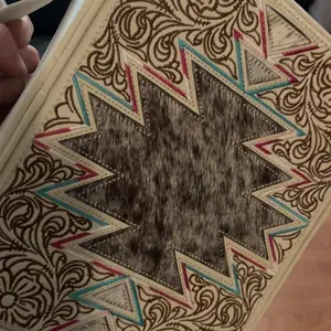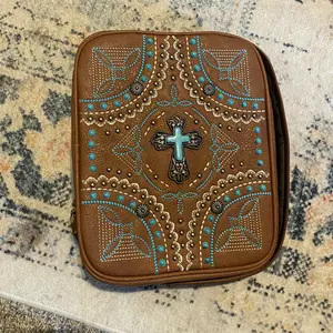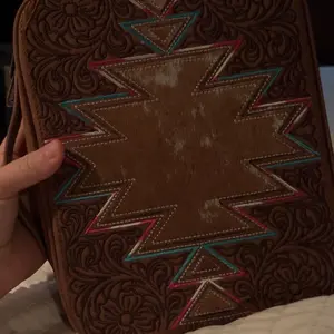 This scripture bag is gorgeous! The tooling on the leather has so much detail, the cowhide is soft. I love the sturdiness of the bag. It has straps on the inside to hold my quad, a journal and a pencil holder. It has an additional pocket on the outside for smaller papers, sticks of gum or markers.