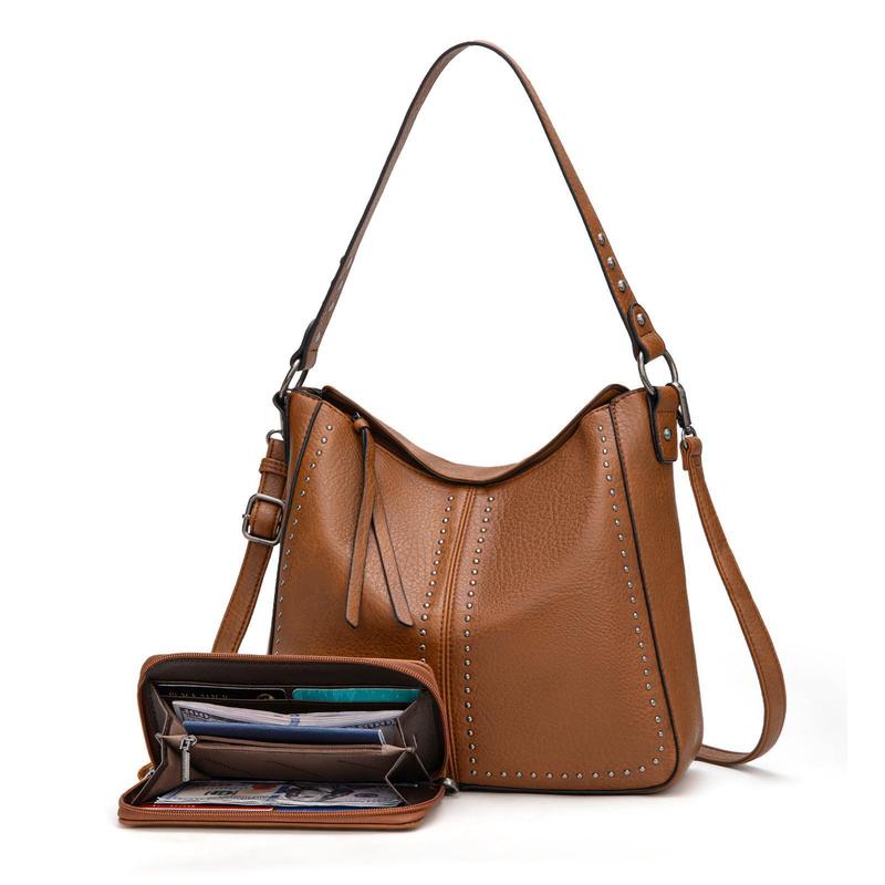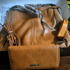 I'm a Montana West fan! I've ordered a couple of purses already. Love the brown color. Purse comes with matching wallet and strap for a crossbody fit. Just disappointed with the delivery this time. Package left on driveway and box was punctured. Leaving a scratch on the purse