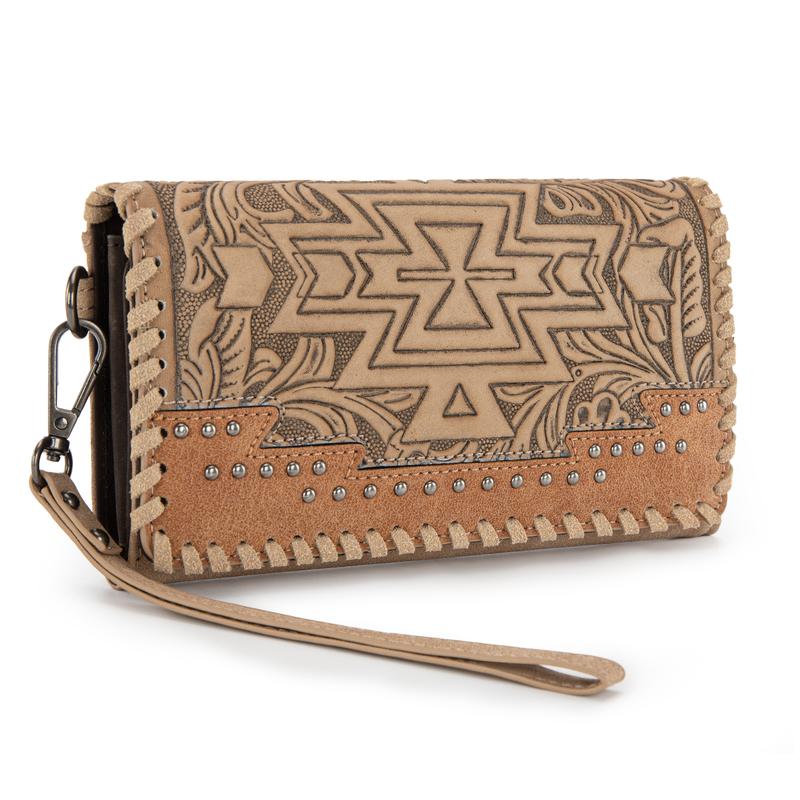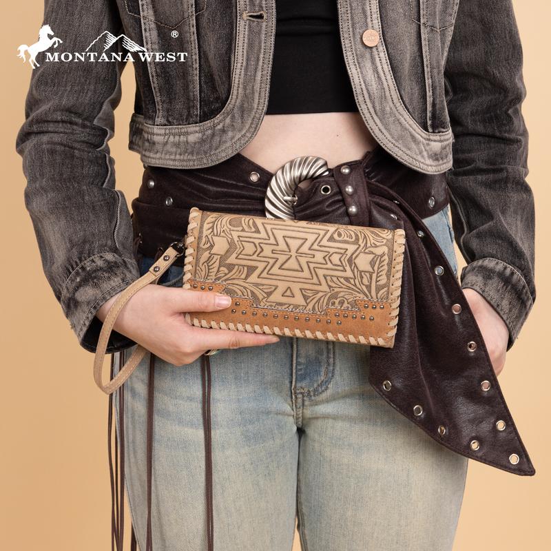 Montana West Western Wallet for Women with Embossed Aztec Design and Studded Accents Brown Leather Clutch