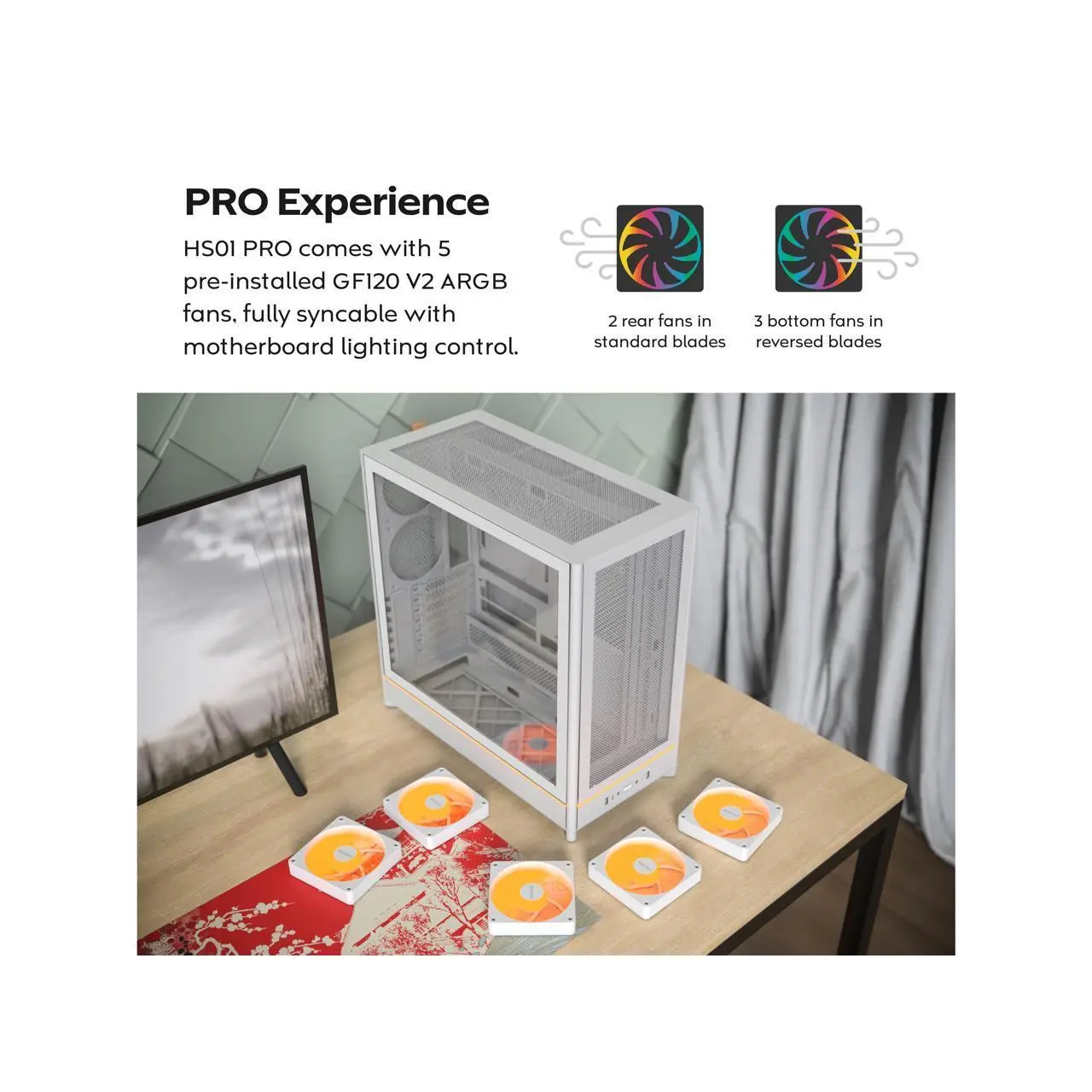 MONTECH HS01 PRO, ATX Mid-Tower PC Case, Gaming PC, High-Airflow, Reversible Layout, Mesh Front Panel, 5x ARGB PWM Fan Pre-Installed, Sink-in Design, Toolless Panels, White