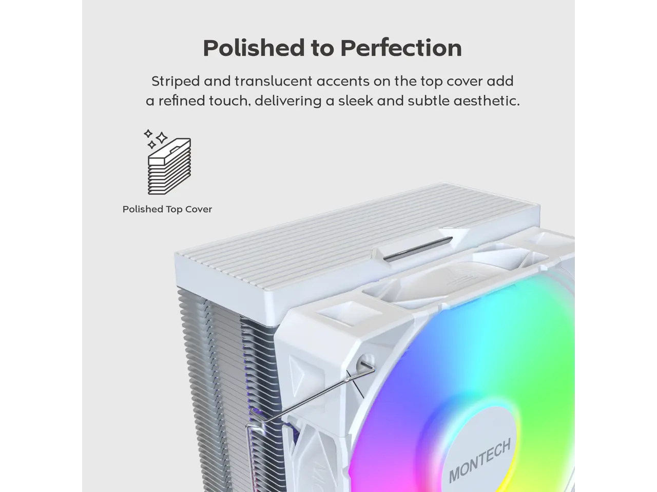 MONTECH NX400 ARGB - CPU Air Cooler, Single Tower, 4 Advanced Heat Pipes, 52-fin Heat Sink, E28, 120mm FDB Static Pressure Fan, 28mm Fan Thickness, Polished Top Cover, ARGB Lightning - White