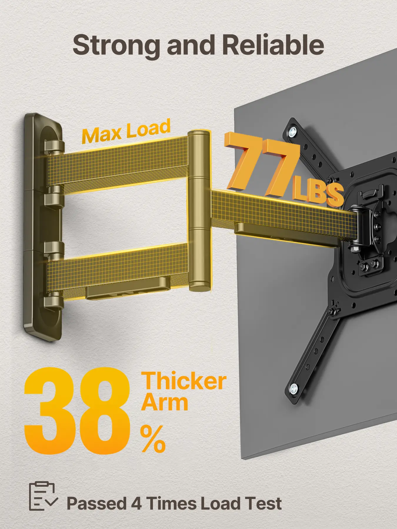 ·Strong & SecureHeavy-duty steel with 38% thicker arms, passed 4× load test. Durable faceplate and security screws for reliable stability.