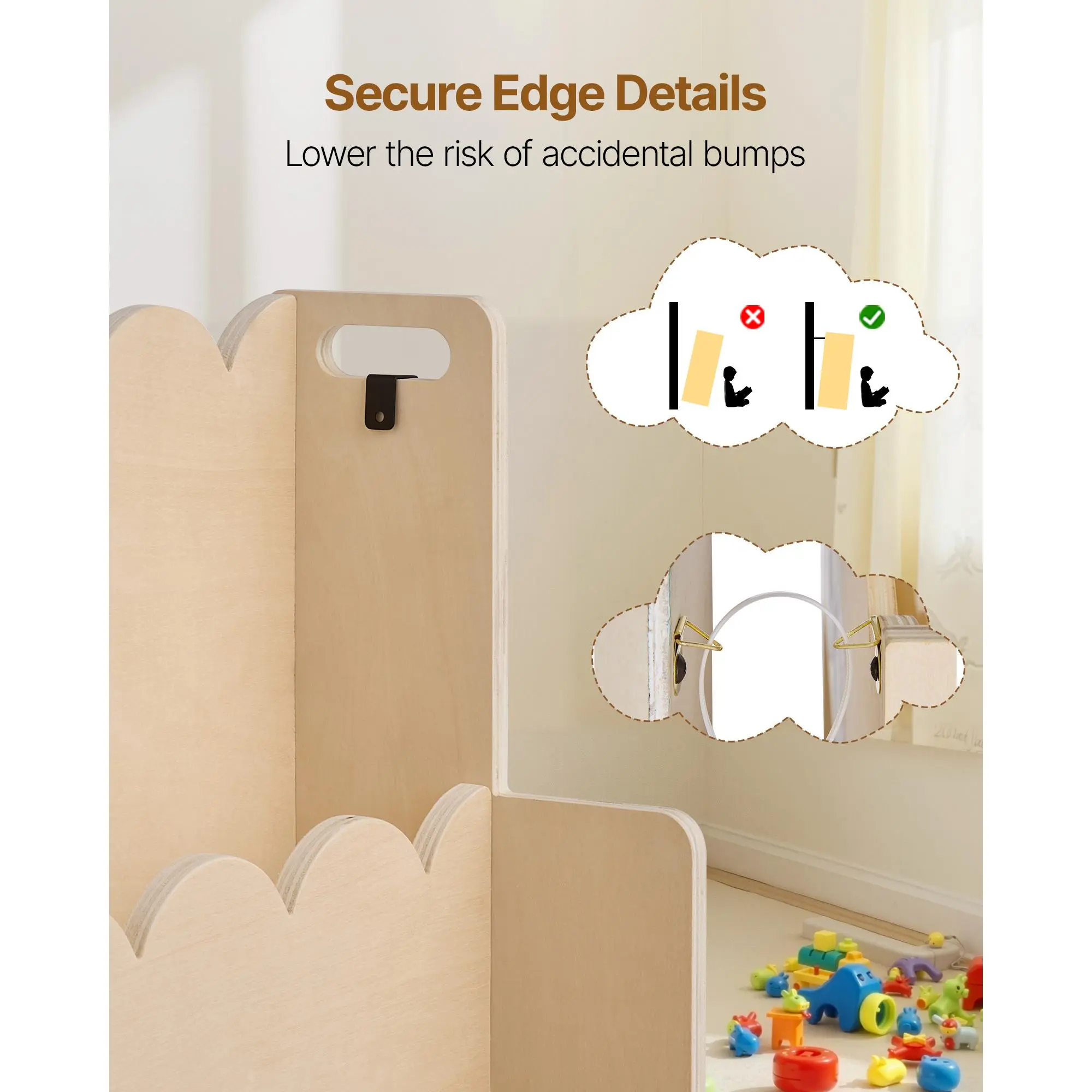 ⢠Caring, Secure Design: Built for durability and reliability. This scalloped bookcase includes an anti-tip kit and rounded edges design to help avoid tipping during use, providing extra peace of mind for parents