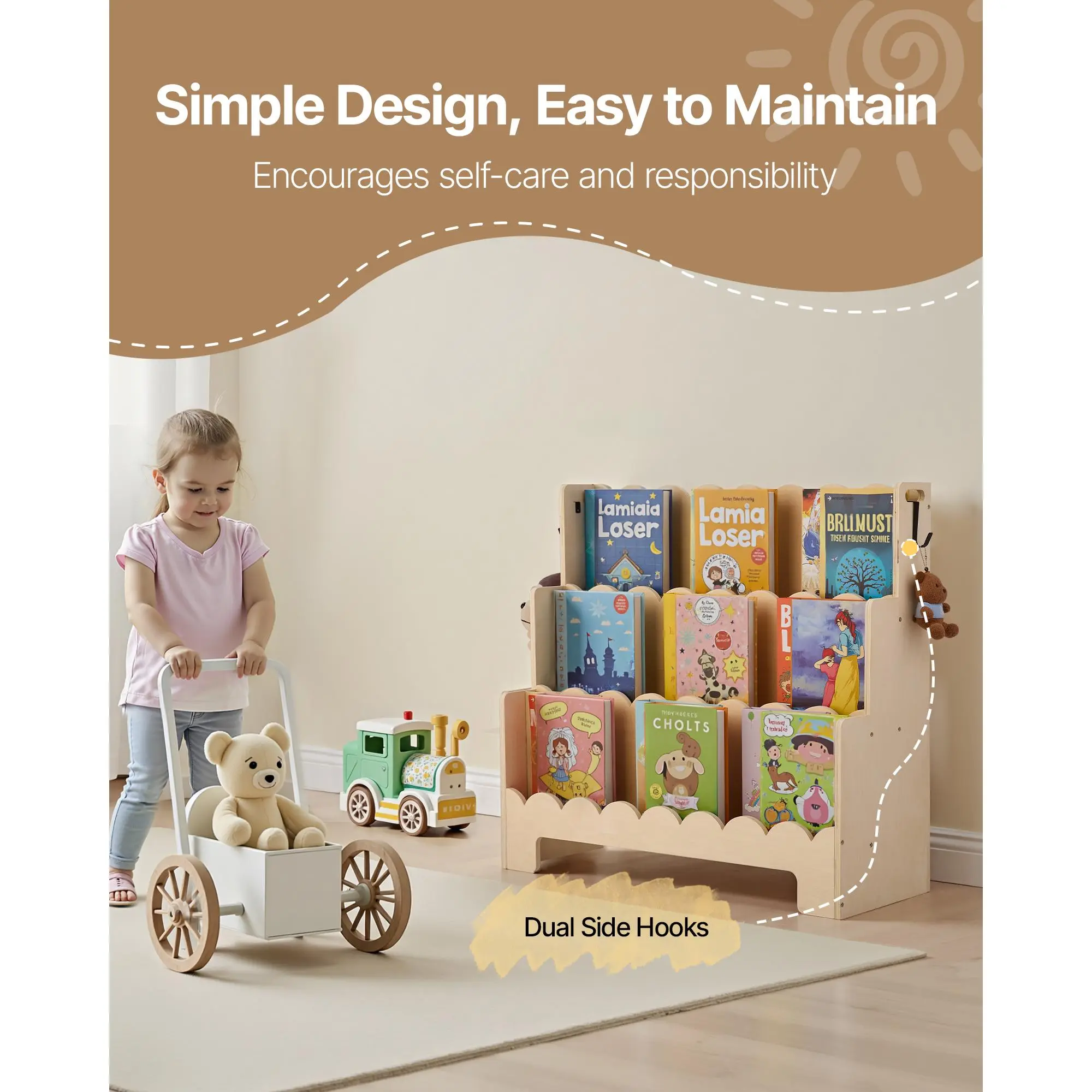 ⢠Streamlined Organization: This scalloped book shelf features 3 compartments and side hooks for hanging bags or cloths. Curved edges and open design keep books, toys, and supplies neatly arranged, helping kids find items easily and build tidy habits from an early age