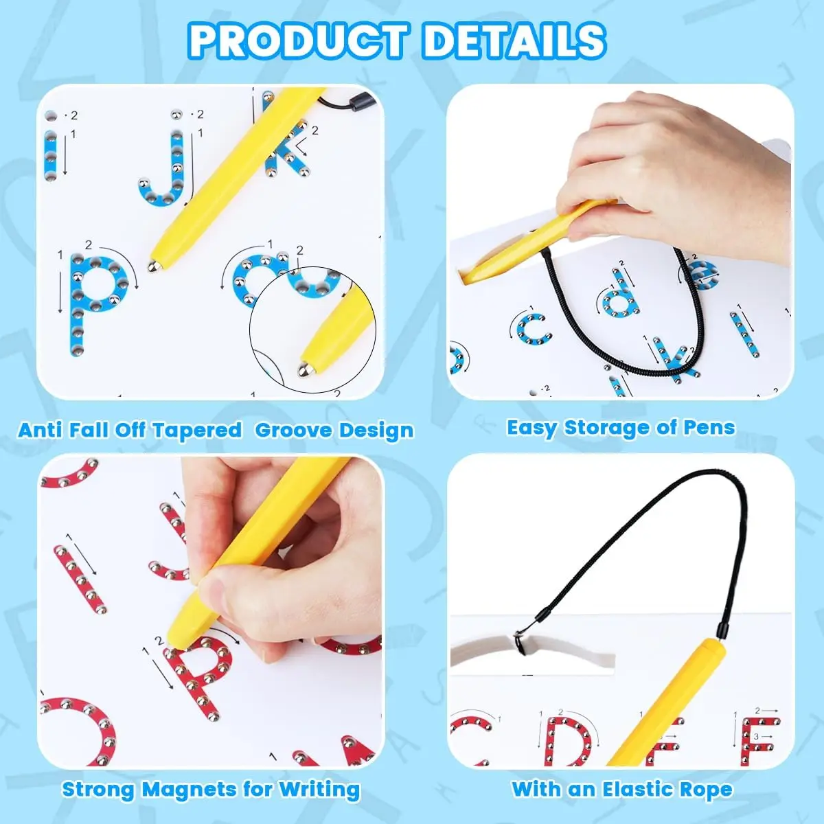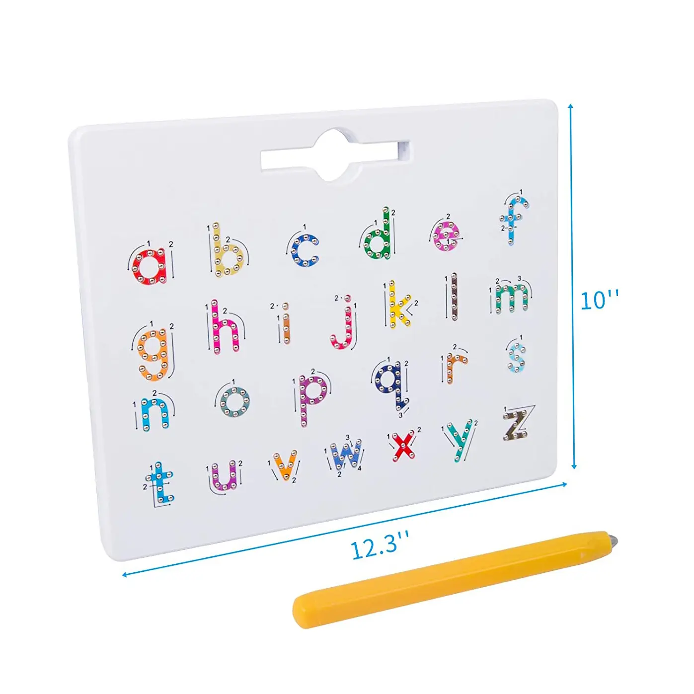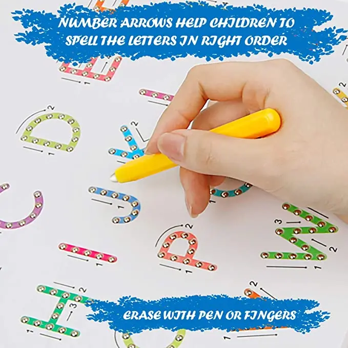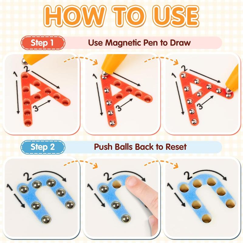 ·Easy & Fun to Use: Use the magnetic stylus pen to trace letters — the magnetic beads pop up with a satisfying click to reveal each letter. Simply press the beads down with a finger or stylus to reset and start again. Safe, mess-free, and endlessly reusable!