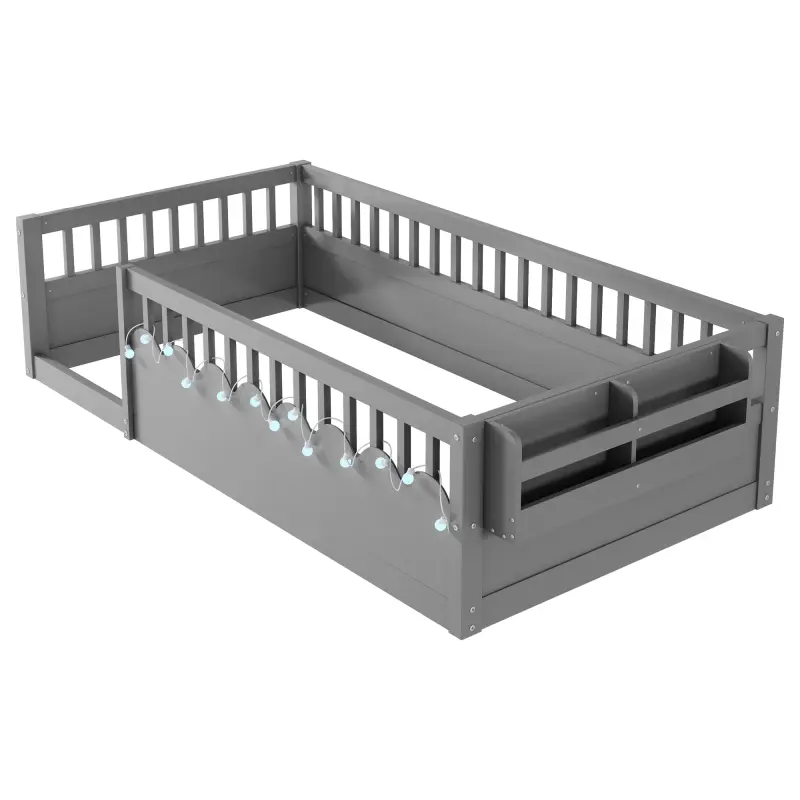 Twin Montessori Floor Bed Frame with High Rails, Wood Kids Floor Beds with Light and Storage Shelf