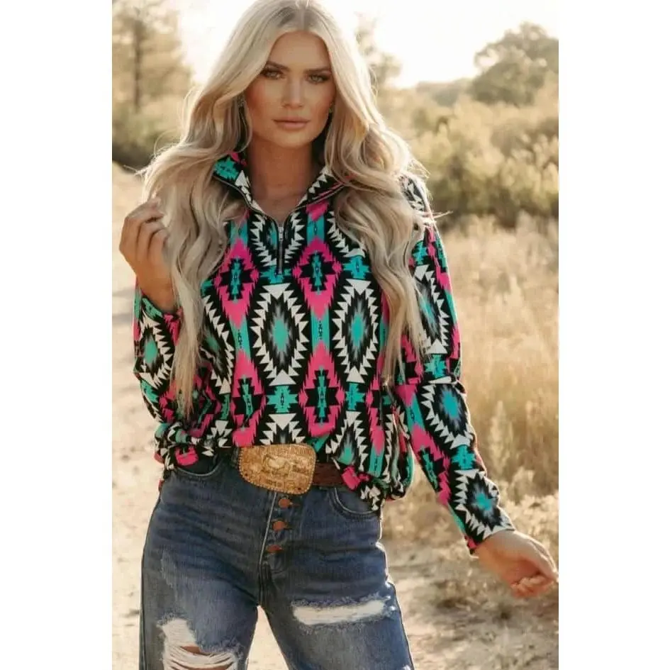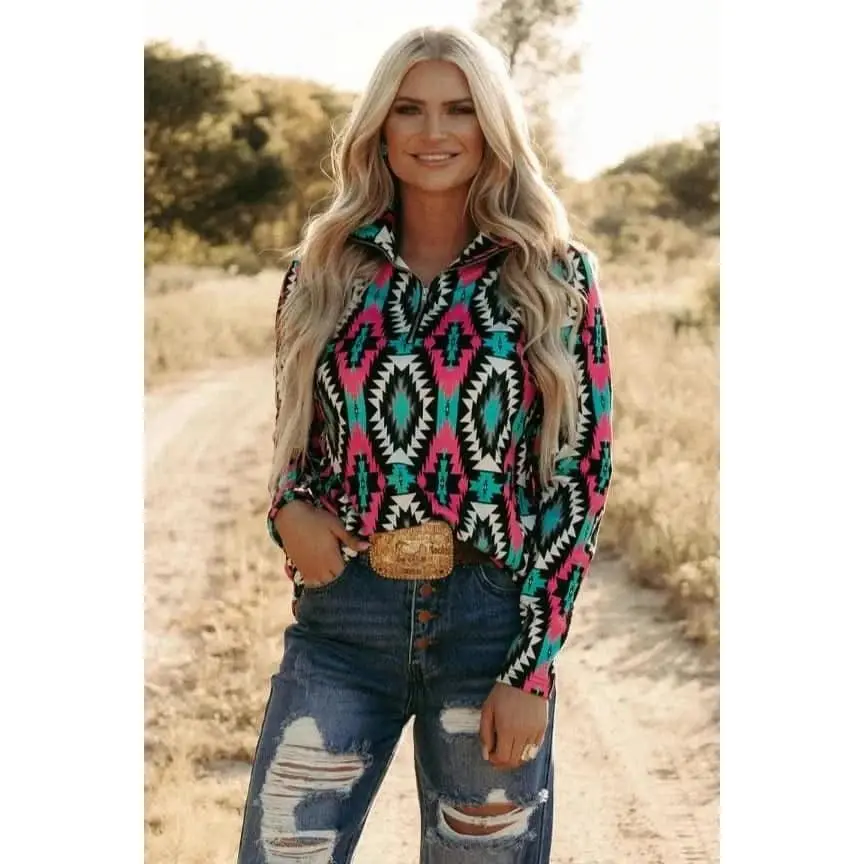 This Aztec pullover top would be a perfect gift for that person in your life that loves the western look 🩷 I am in a size 2XL. #aztecpullover #pullovertop #sweatshirt #westernfashion #westernstyle