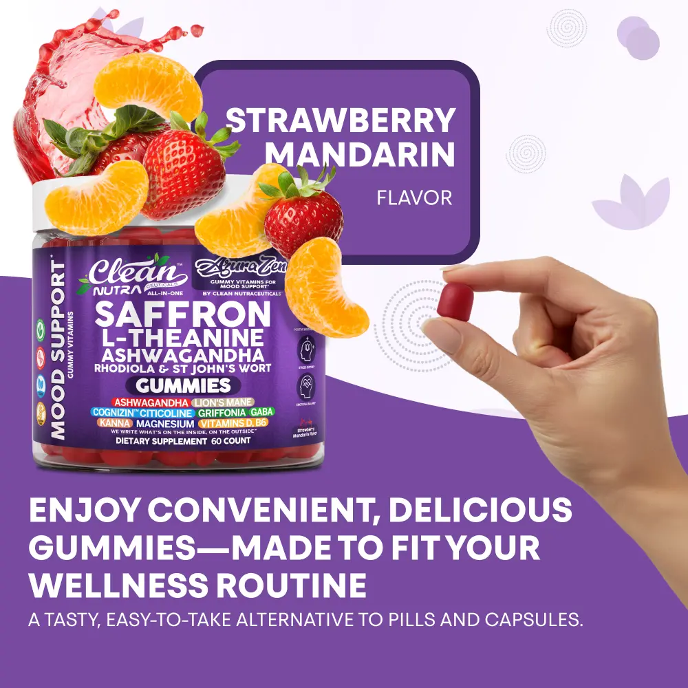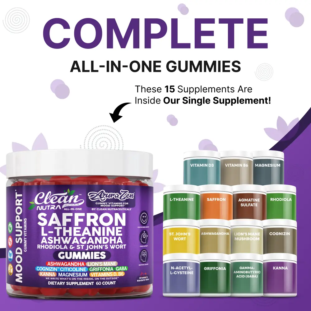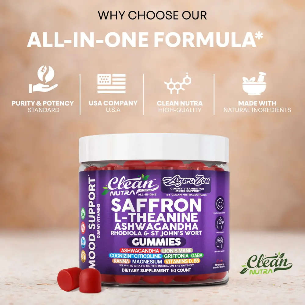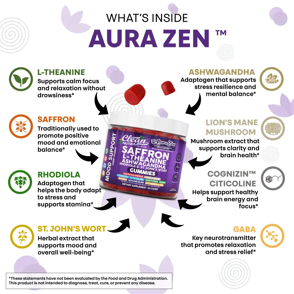 Clean Nutra Aura Zen is a premium gummy formula designed to support mood balance, emotional wellness, and daily stress resilience. Powered by 16 ingredients including Saffron, L-Theanine, Ashwagandha, Rhodiola, and St. John's Wort, this formula offers a plant-based approach to supporting mental clarity and calm.