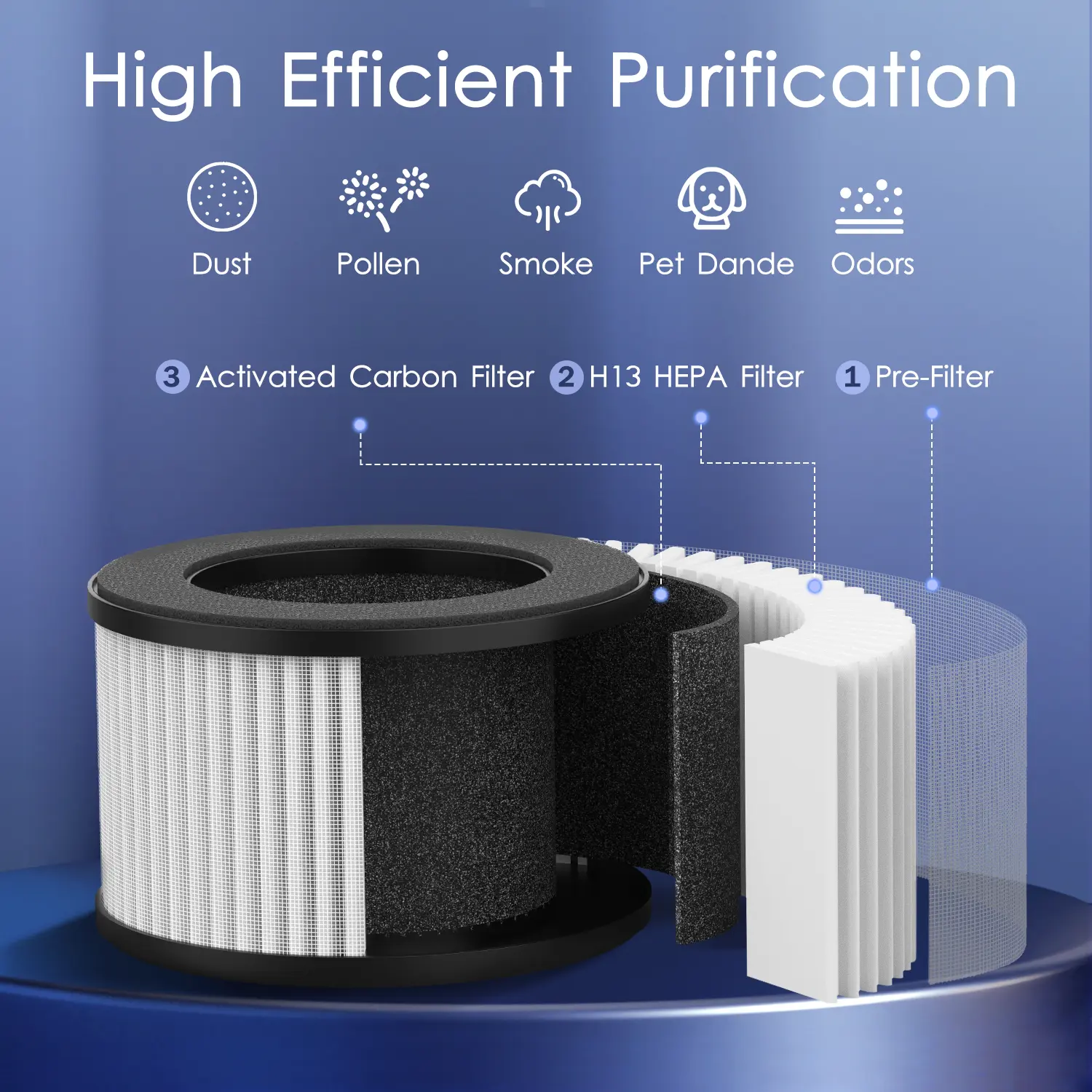 H13 True HEPA Filter: 3 Layer that could capture 99.97% of dust, pollen, smoke, and pet dander.