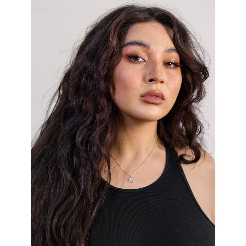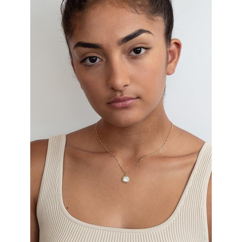 This radiant moon pendant designed with Michelle Danzinger (@michelledanzinger) showcases a luminous half-moon shape covered in sparkling cubic zirconia and an iridescent Mother-of-Pearl accent. Dipped in 14K gold, this crescent moon necklace looks gorgeous when paired with pearl jewelry. You can wear the moon pendant alone or layer it with other celestial-themed necklaces to create a unique look.