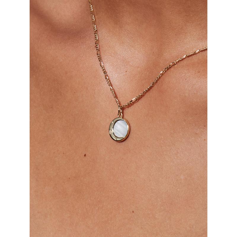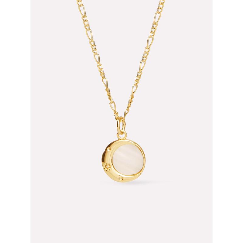 • Gold necklace with an iridescent Mother-of-Pearl pendant • Features a crescent moon framed by sparkling Cubic Zirconia • Dipped in 14K gold