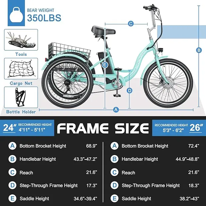 ·7-Speed Electric Tricycle: Our E-Trike comes with 7-speed derailleur and shifters which provide a wide gear range and smooth shifting, various speeds are suitable for different road conditions