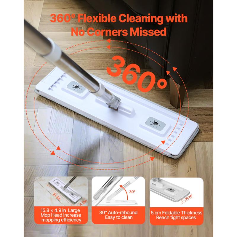• 360° Flexible Cleaning: This flat mop rotates 360° for easier cleaning of hard-to-reach areas like under the bed, sofa, narrow spaces, and corners. The 30° automatic rebound feature makes it more convenient to clean the mop without manual adjustments, while the mop head allows you to pour in cleaning solution to tackle stubborn stains deeply.