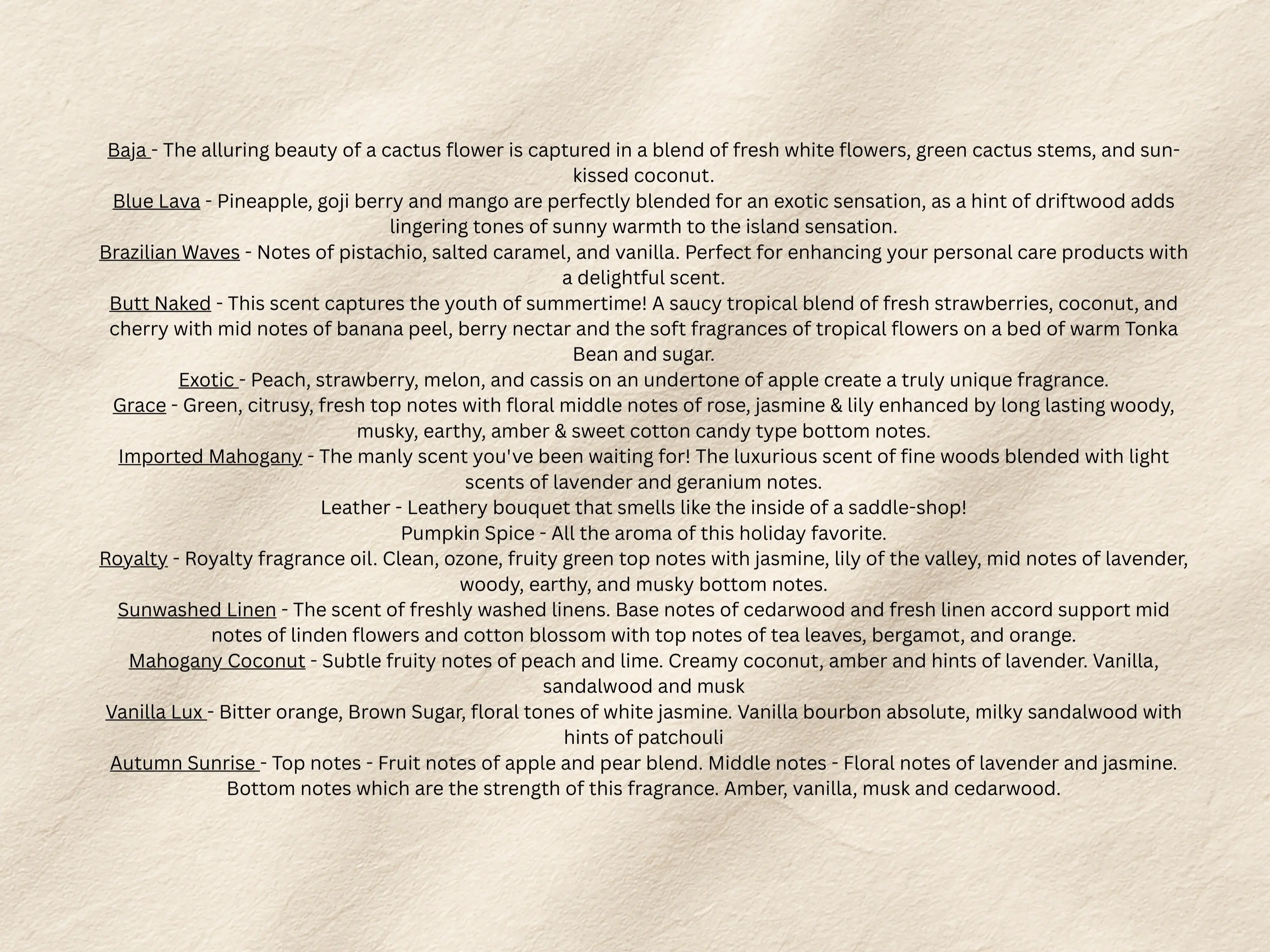 Baja -A refreshing blend of floral, coconut, and citrus on a base of musk and sandalwood.
