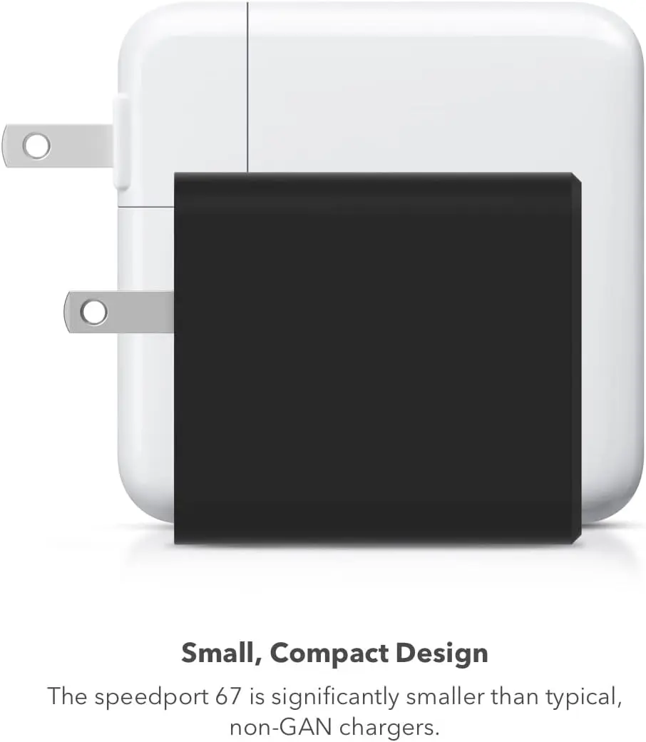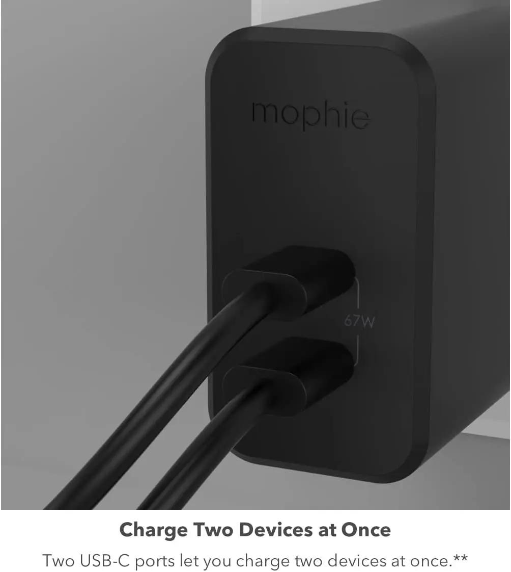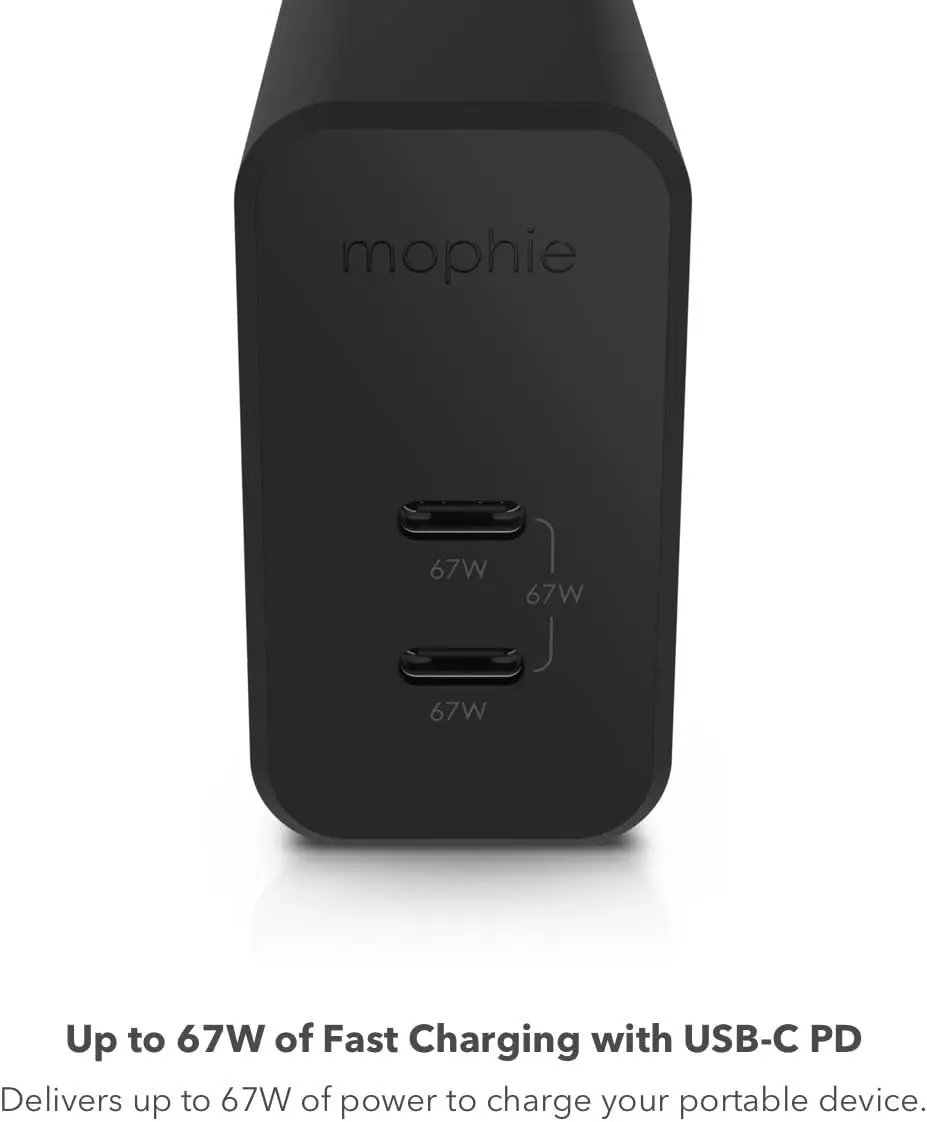 Ever been stuck with a dead device and nowhere to plug in? The Mophie Speedport 67 USB-C GaN Charger is your new best travel buddy. Delivering a powerful 67W output, this charger quickly juices up your iPhone, MacBook Pro/Air, iPad Pro, Samsung Galaxy, Google Pixel, or HP Spectre without breaking a sweat. With two USB-C ports, you can power up your phone and laptop simultaneously—no more waiting around. Its foldable prongs tuck neatly away, making it perfect for slipping into your bag or pocket. Plus, the sleek black casing is crafted from post-consumer recycled plastics, so you’re making a greener choice while charging. Please note, charging cables are not included, so be sure to have your USB-C cords ready. Whether you’re working from a café or jet-setting across the country, stay powered up with this compact, eco-friendly fast charger. Grab yours today and say goodbye to low battery anxiety!