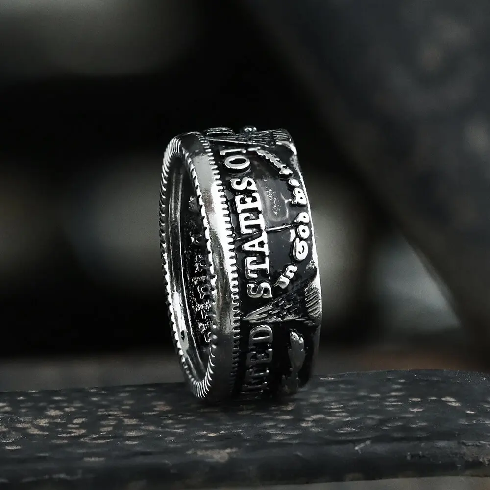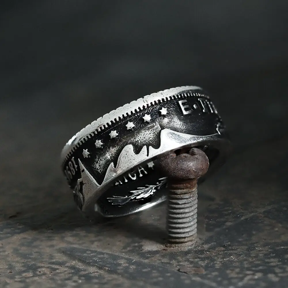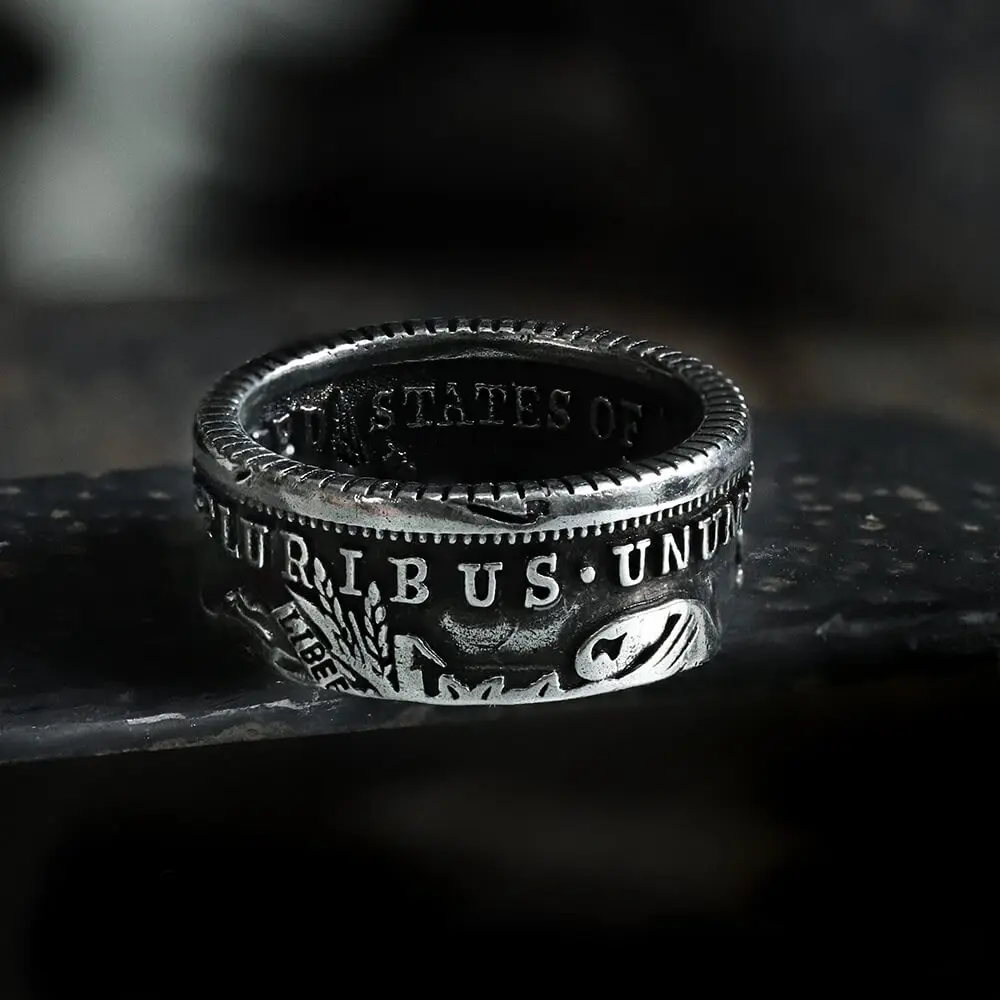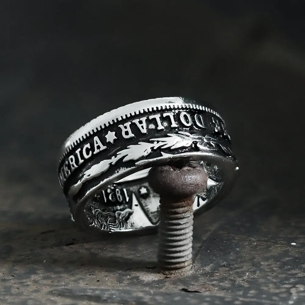 ·The Morgan dollar is a United States dollar coin minted from 1878 to 1904, The obverse depicts a profile portrait representing Liberty, while the reverse depicts an eagle with wings outstretched. This dollar is the most popular collectible coin after Lincoln 1 cent because it has exquisite design and is inexpensive. So, this ring is both beautiful and worth wearing.