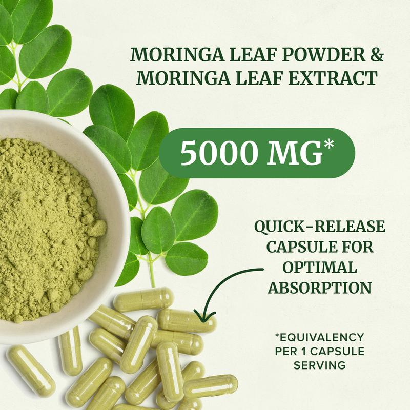 Moringa leaf is a nutrient powerhouse, containing more amino acids, vitamins, and minerals per gram than any other plant. Our Moringa capsules deliver 5000mg per serving, ensuring maximum absorption and full-body benefits. Each capsule is quick-release, supporting your health efficiently.