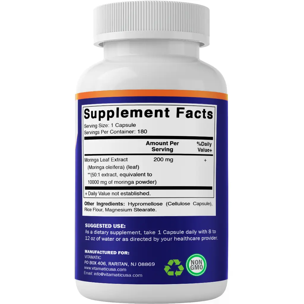 5. Vitamatic Moringa Capsules - 180 Capsules - 50:1 Extract 200 mg - Pure Moringa Oleifera Leaf Powder Supplement - Green Superfood Powder Capsules - Non-GMO, Made in The USA