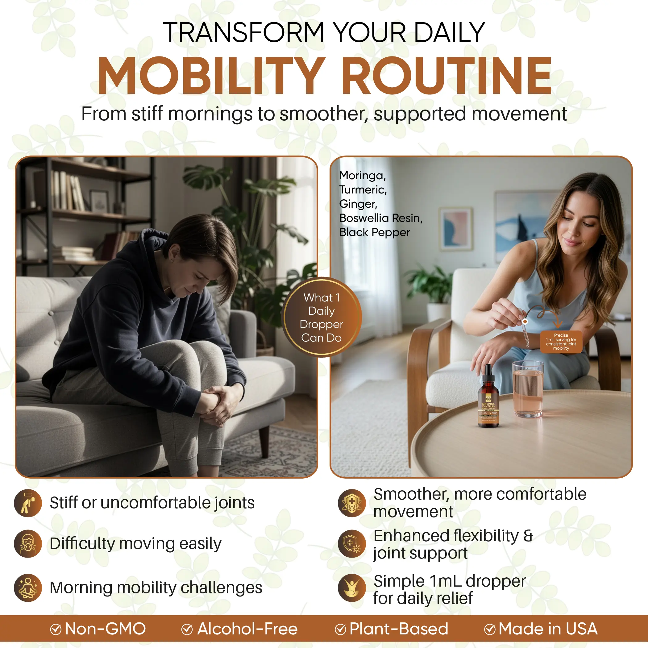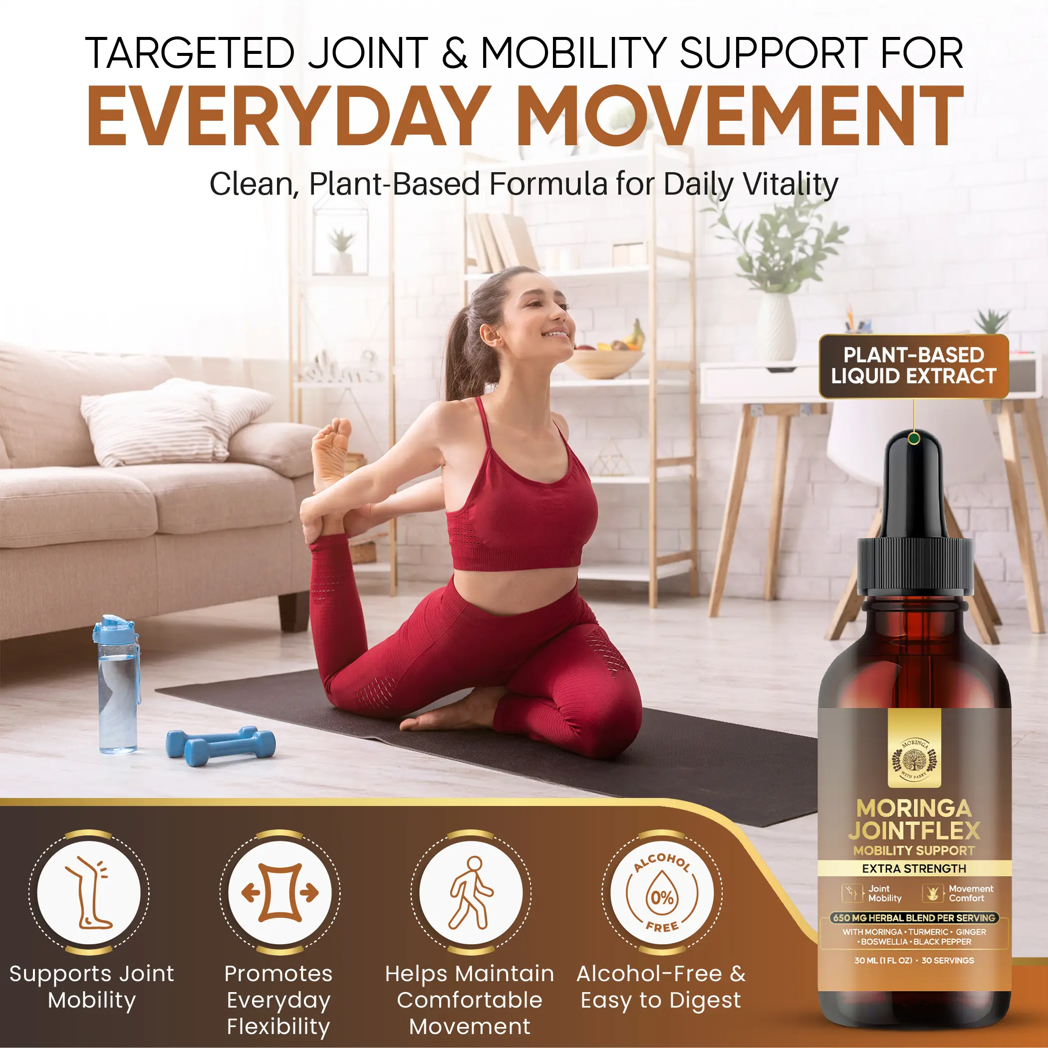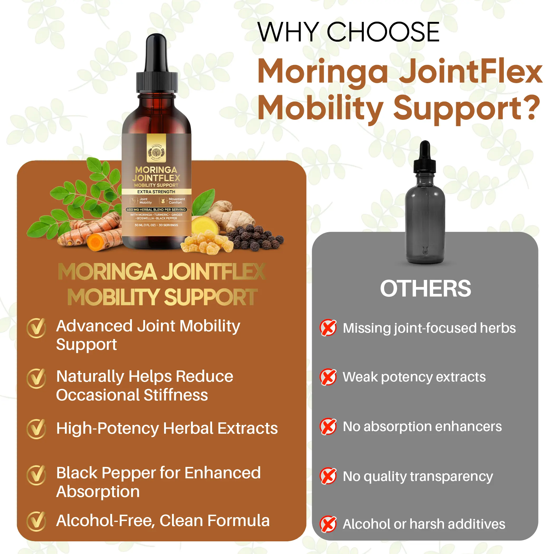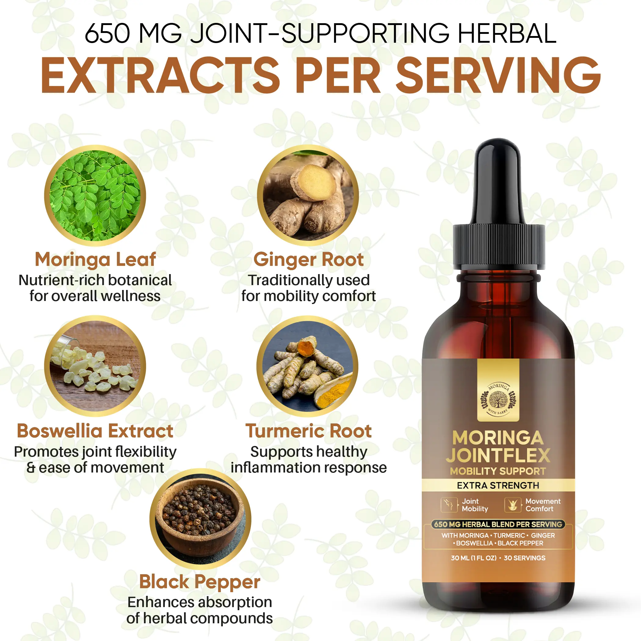 Moringa JointFlex Mobility Support is a thoughtfully crafted multi-herb botanical extract designed to support joint comfort, flexibility, and everyday movement. This targeted formula blends Moringa, Turmeric, Ginger, Boswellia, and Black Pepper—botanicals traditionally used to support joint health, mobility, and an active lifestyle.