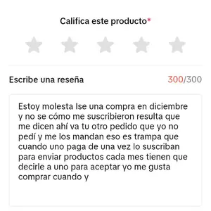 Estoy molesta Ise una compra en diciembre y no se cómo me suscribieron resulta que me dicen ahí va tu otro pedido que yo no pedí y me los mandan eso es trampa que cuando uno paga de una vez lo suscriban para enviar productos cada mes tienen que decirle a uno para aceptar yo me gusta comprar cuando y