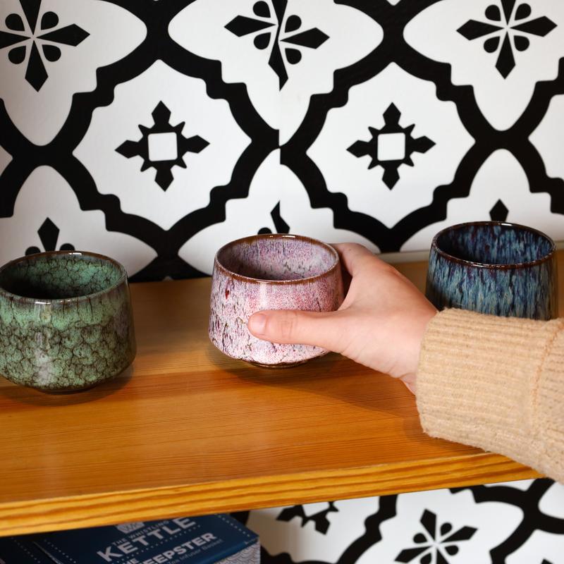 I bought the green one. The glaze is lovely & interesting plus the shape of the cup is even more attractive in person than I had anticipated. I steeped 1g of a mixed green/white tea IN a strainer in the cup so weighed the 4 oz./113g of 180 degree water I poured in. The cup was uncomfortable to hold for some time after the 2.5-minute steep elapsed, taking more time to cool than I would like. That, to me, is the one negative about the cup. Well, it's not dirt cheap for the size either so perhaps cost is a minor negative too. Definitely a cup to use for mate, green, or white teas giving the tendency of the material to hold heat yet no handle. Knowing that, I may not buy a second green cup or collect the other colors despite the beauty. I find espresso cups suitable for steeping small servings of tea. The ones I use are a boring solid white but they DO have handles. If you like to sip your teas s-l-o-w-l-y over some time, this cup may work particularly well for a patient person like you.