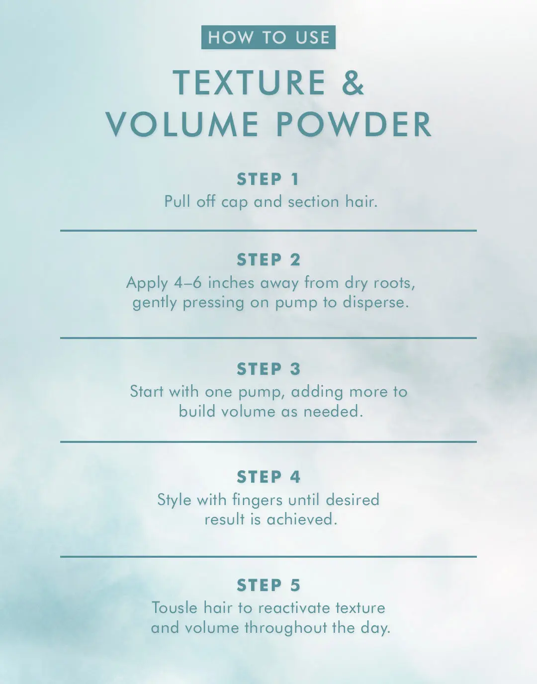 To reactivate the volume benefits throughout the day, simply tousle the hair. This will ensure that the hair stays voluminous and looking great all day, even after initial application of the product. It won’t weigh down the hair or leave it feeling sticky, making it the ideal product for fine, thin, or flat hair.