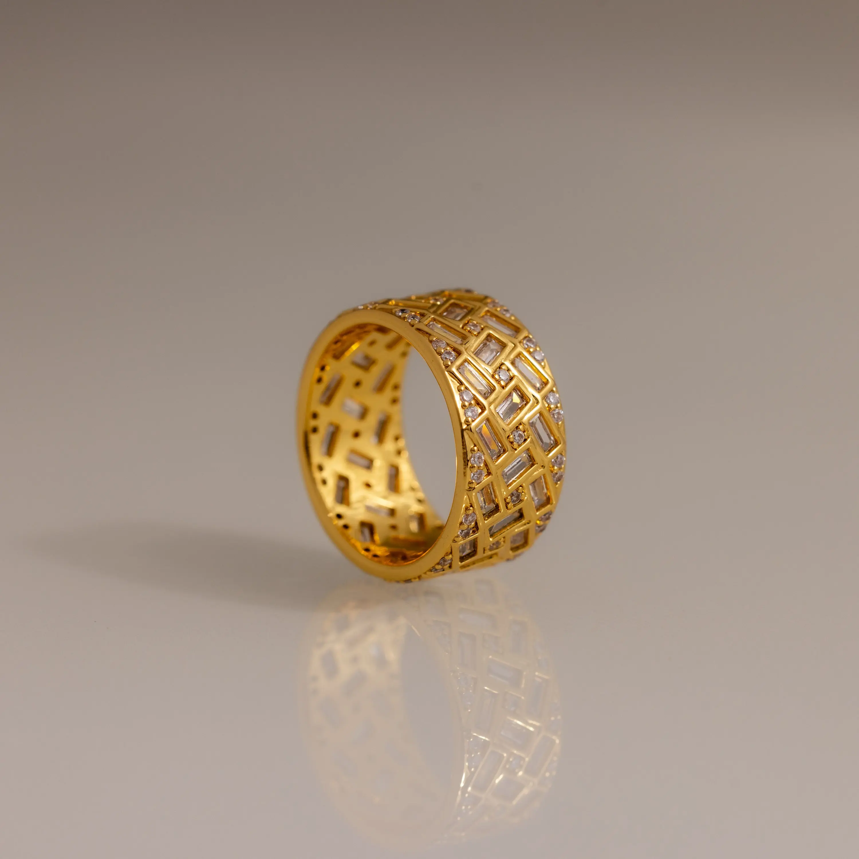Bold and architectural, our Mosaic Diamond Baguette Ring is designed to make a statement. Featuring an intricate grid of baguette-cut stones accented with delicate pavé details, this wide band catches the light from every angle with a rich, sculptural presence. A striking bold ring that blends modern glamour with timeless elegance, perfect for special occasions or elevating an everyday outfit with confidence.