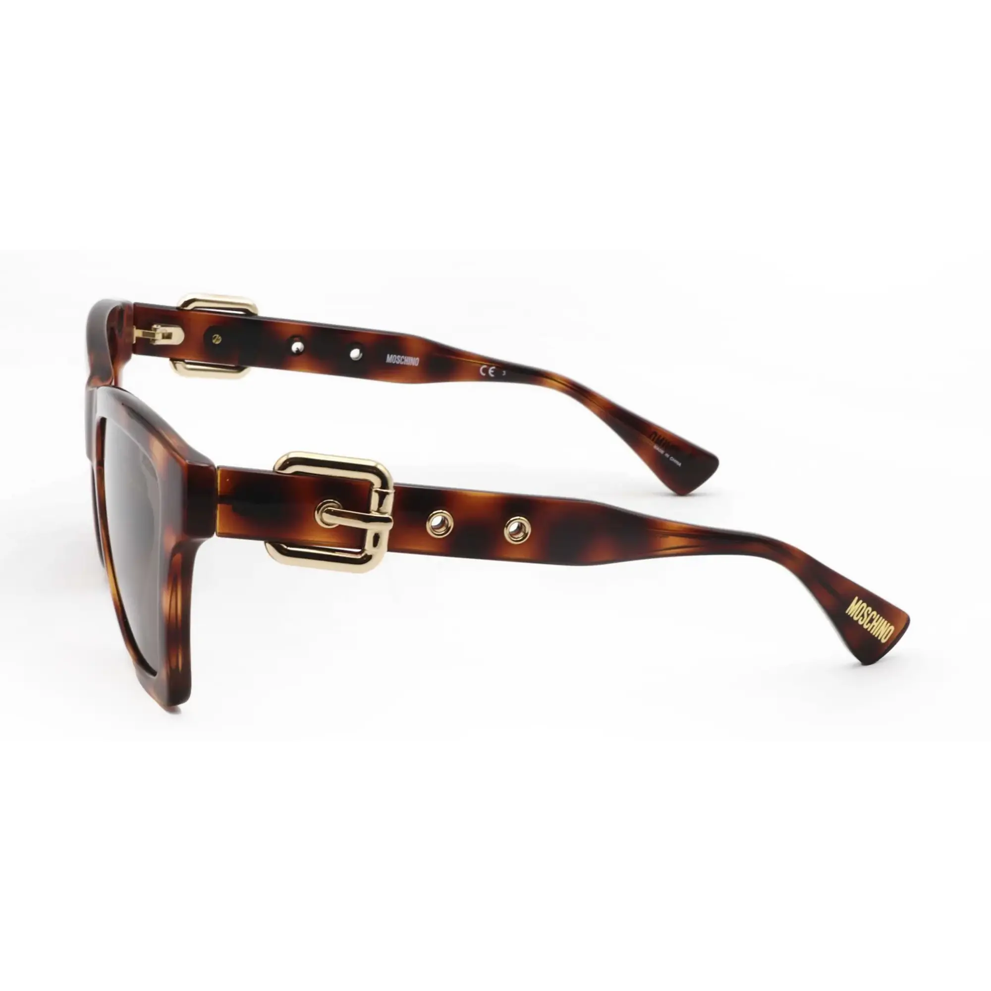 - Bold tortoiseshell sunglasses from Moschino with a sculpted, statement-making frame.