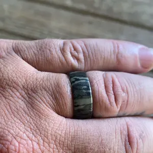 Great rubber ring looks great. Definitely like the camo. Wife even said it fits me. Definitely should have went up a size tho. All my others are 9 but this one is really tight. Definitely go up a size. Will probably have to order another one in a 10