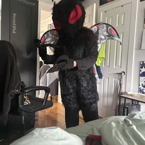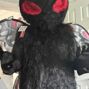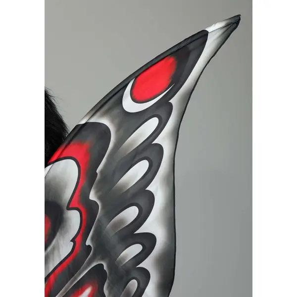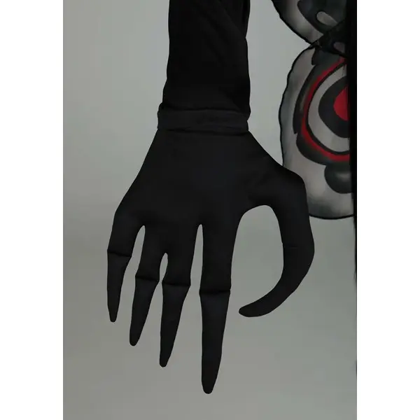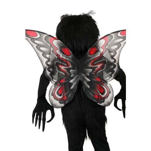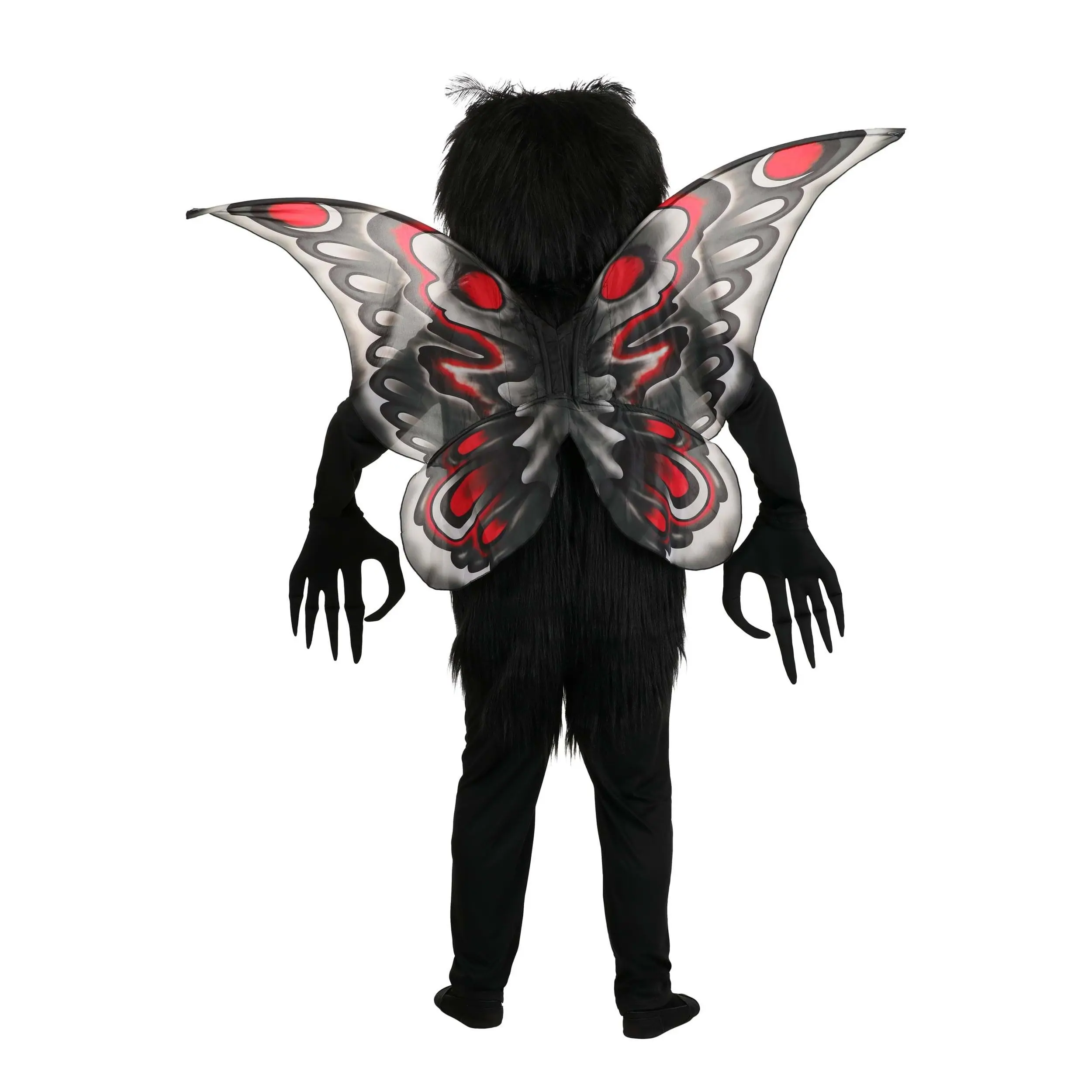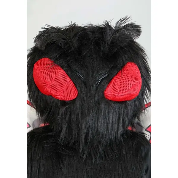 Flap into any Halloween party with the most original costume when you wear this exclusive Mothman Costume for Adults! The full-length black jumpsuit has soft faux fur on the torso to simulate a moth's downy body. The oversized headpiece is also covered in faux fur, except for two huge red eyes that also serve as viewing ports so that you can see where you're going. A pair of gloves with long fingers and hooked thumbs adds to the costume's creepiness. The red, grey and black wings are stretched over wire to give them body. FYI, flying with them has not been tested.
