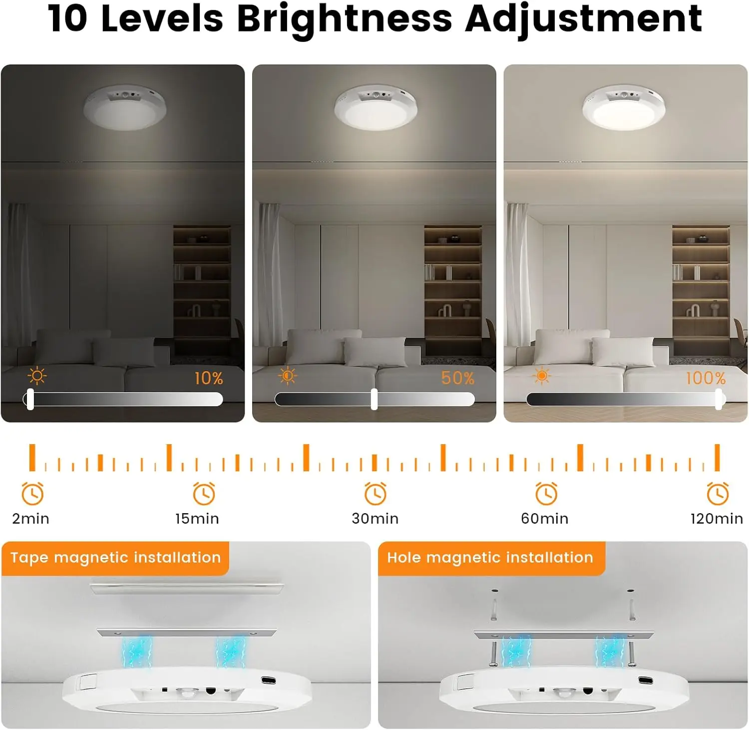 This ceiling light features a rechargeable battery and fully wireless installation, eliminating the need for hardwiring. Ideal for areas without power access such as closets, stairs, hallways, and sheds.
