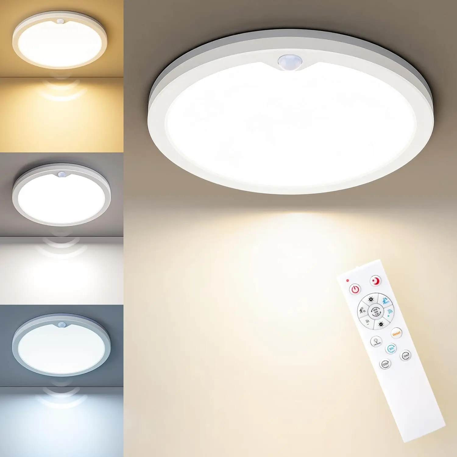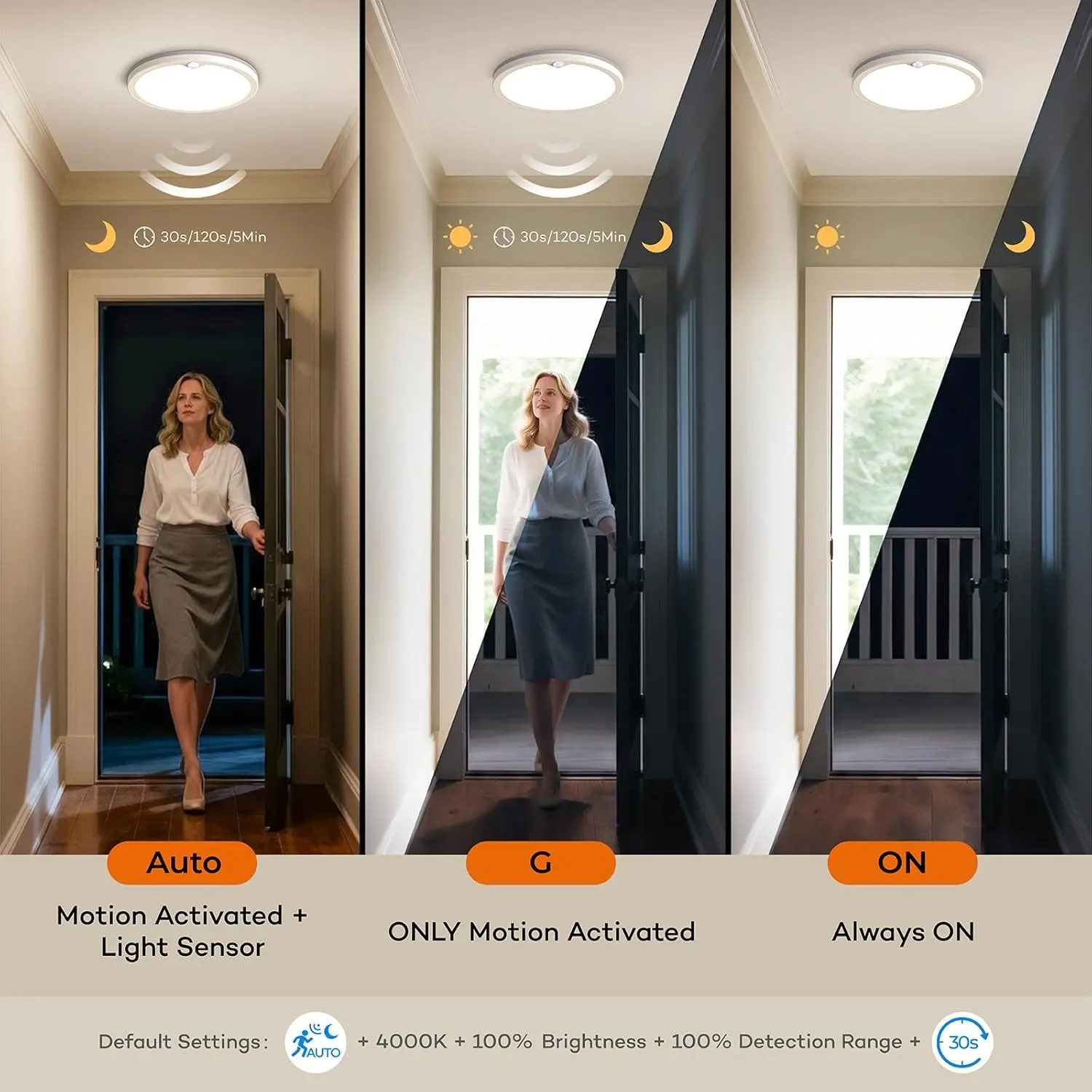 Remote Control: motion ceiling light with remote help you personalize the color temperature, detection range (shorten by 35% or max), Auto/G/ Mode, Nightlight, brightness level (10%~) and light- time (30s/120s/5Min).