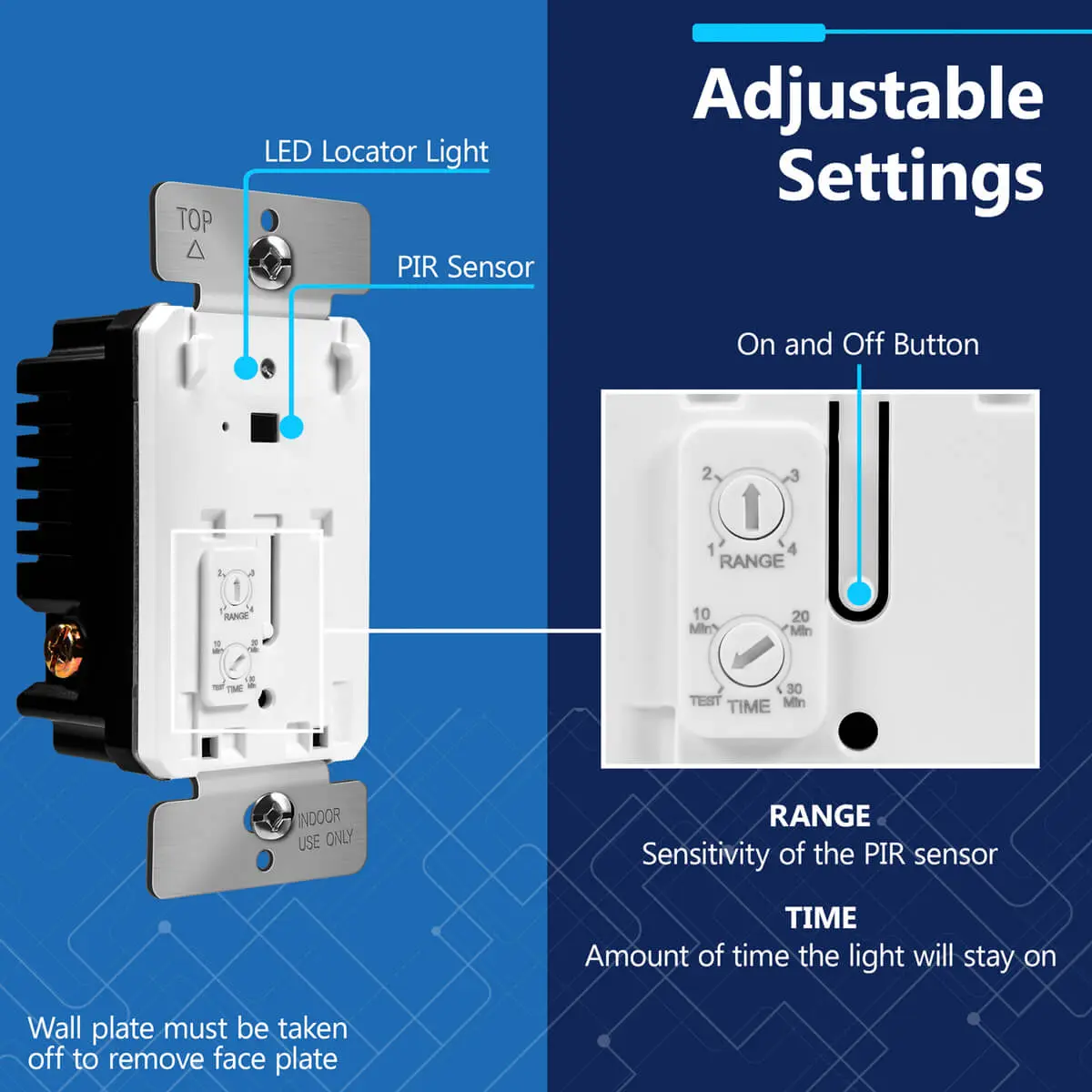 Equipped with an advanced Passive Infrared (PIR) sensor with a 180° field of view and adjustable sensitivity levels (25%, 50%, 75%, 100%), this switch ensures precise motion detection while minimizing false triggers from background movements. It automatically controls lighting based on occupancy, with customizable time delay settings to suit user preferences, promoting energy savings and convenience.