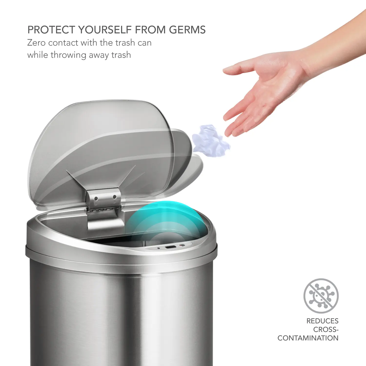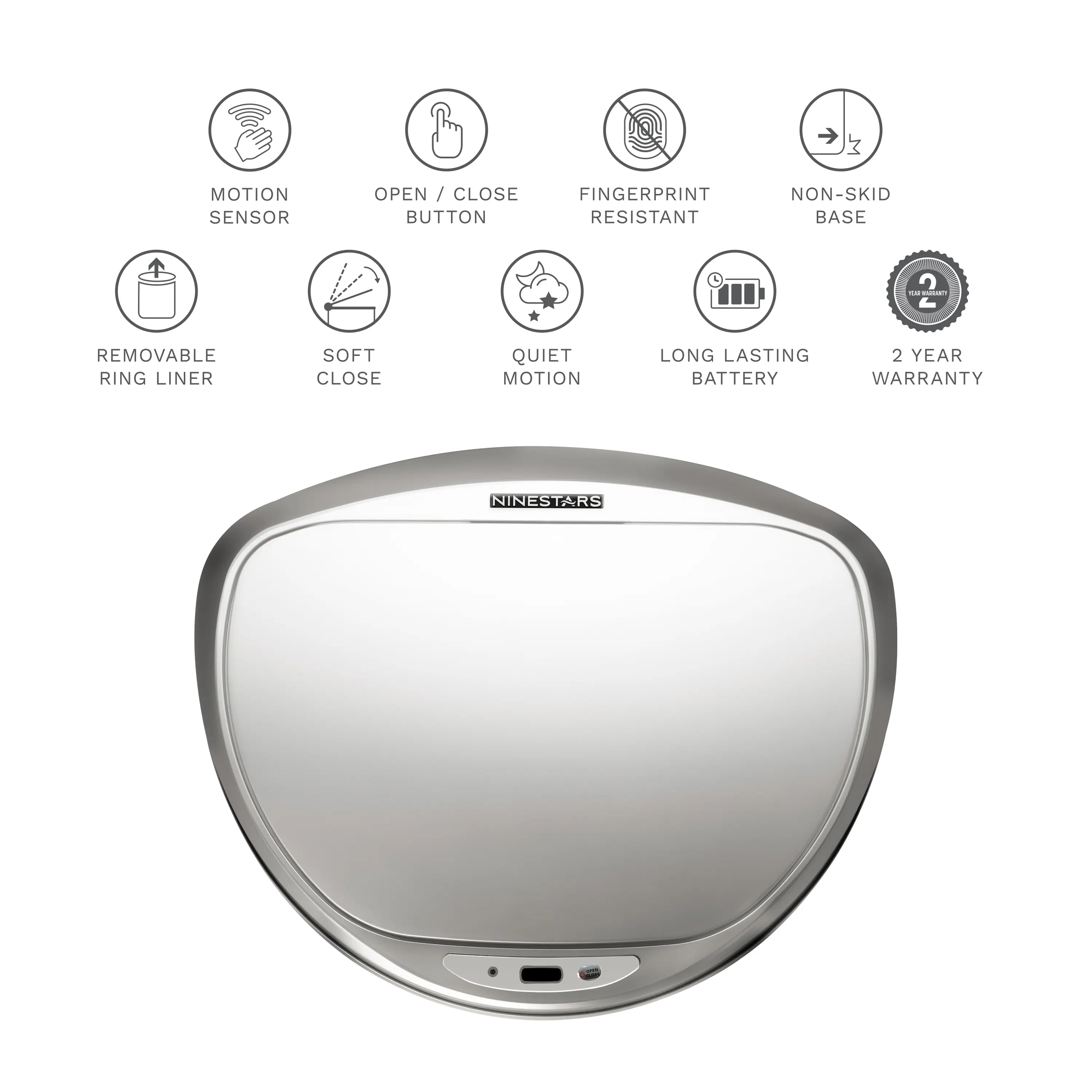 Ninestars Automatic Motion Sensor trash can has a hands-free lid, which opens with a simple wave of the hand. Advanced infrared technology preserves battery life while non-skid base protects your flooring from scuff marks. The large opening and capacity can handle all of your household trash needs with ease. Built-in manual mode keeps the lid open longer for bigger cleanups. Removable ring liner keeps trash bag securely in place. Fingerprint resistant Stainless steel makes cleaning a breeze.