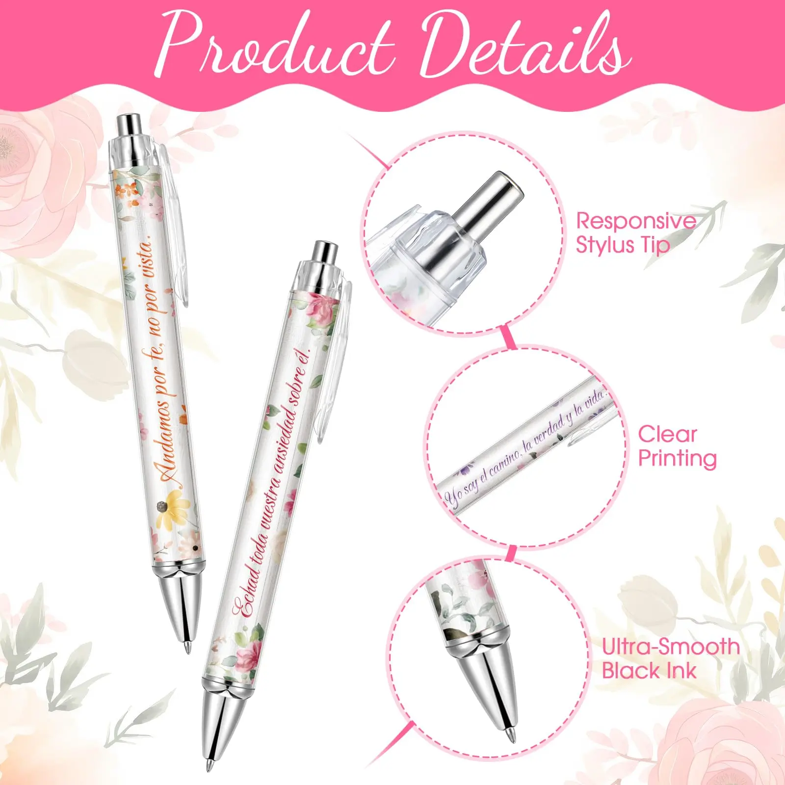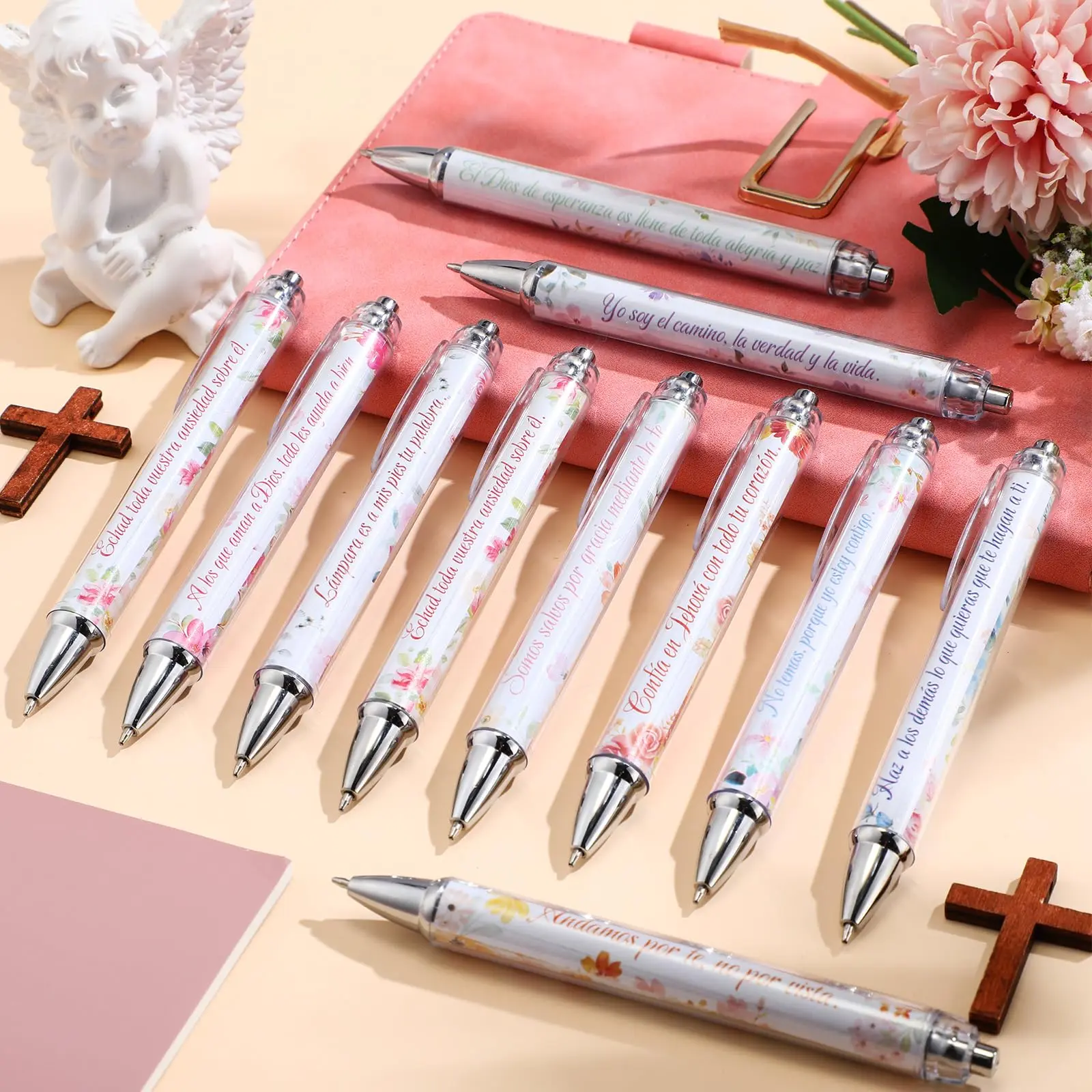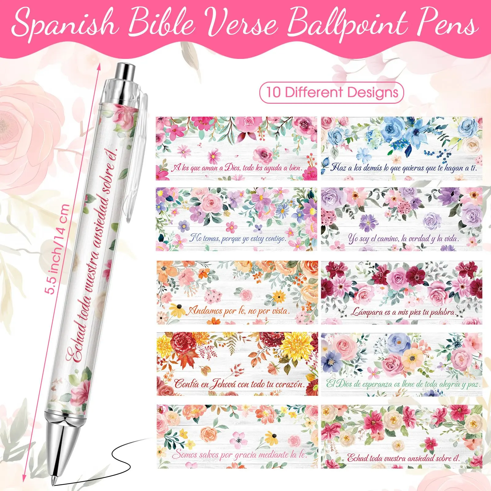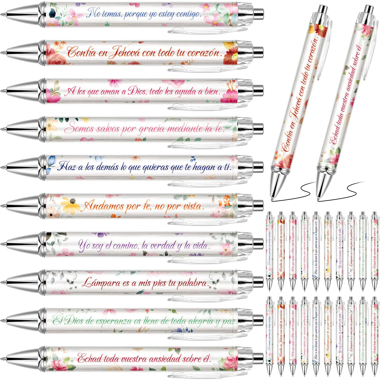 Spanish Christian Theme: there are 20 Spanish Christian theme ballpoint pens in 10 different styles, printed with Spanish scriptures and beautiful flower patterns: