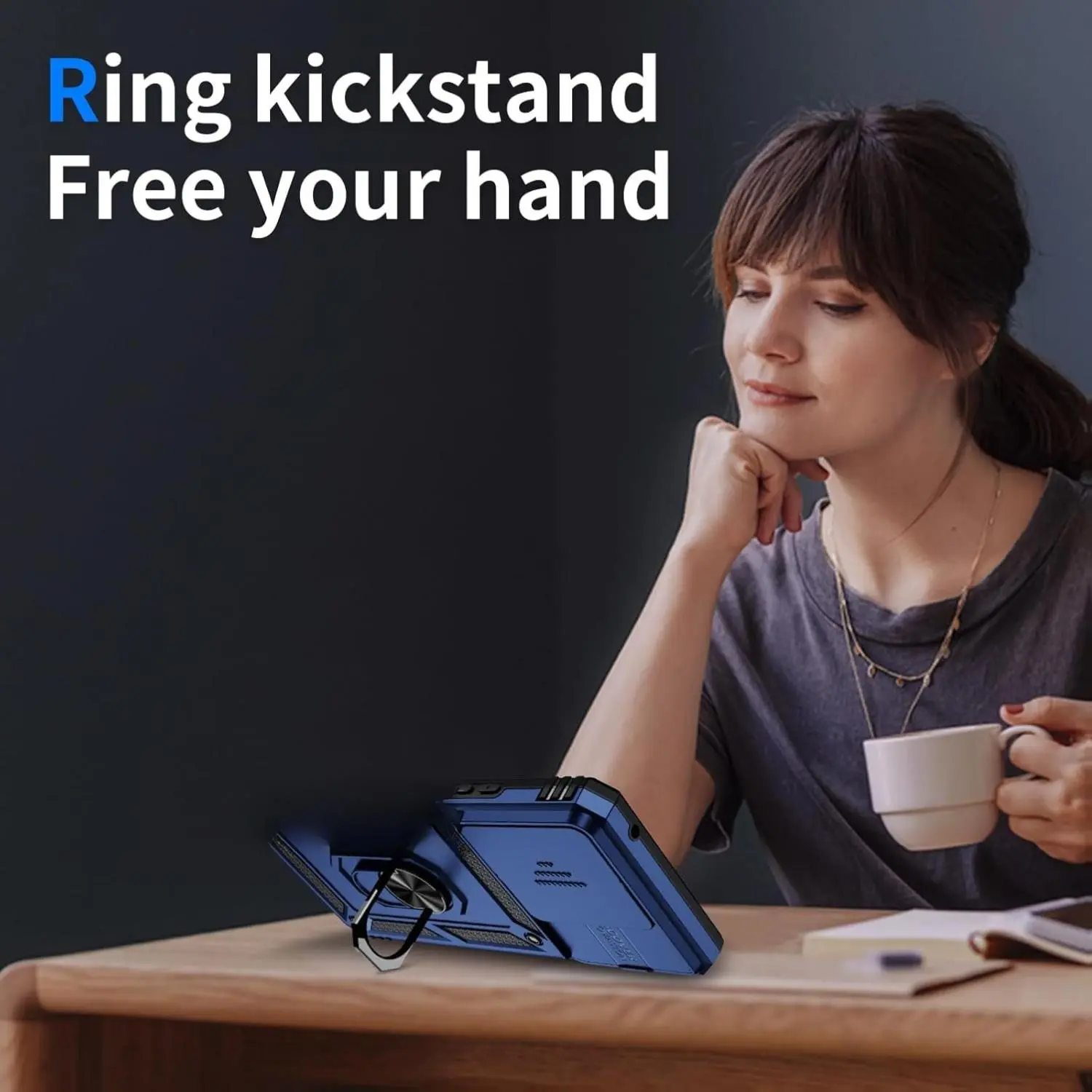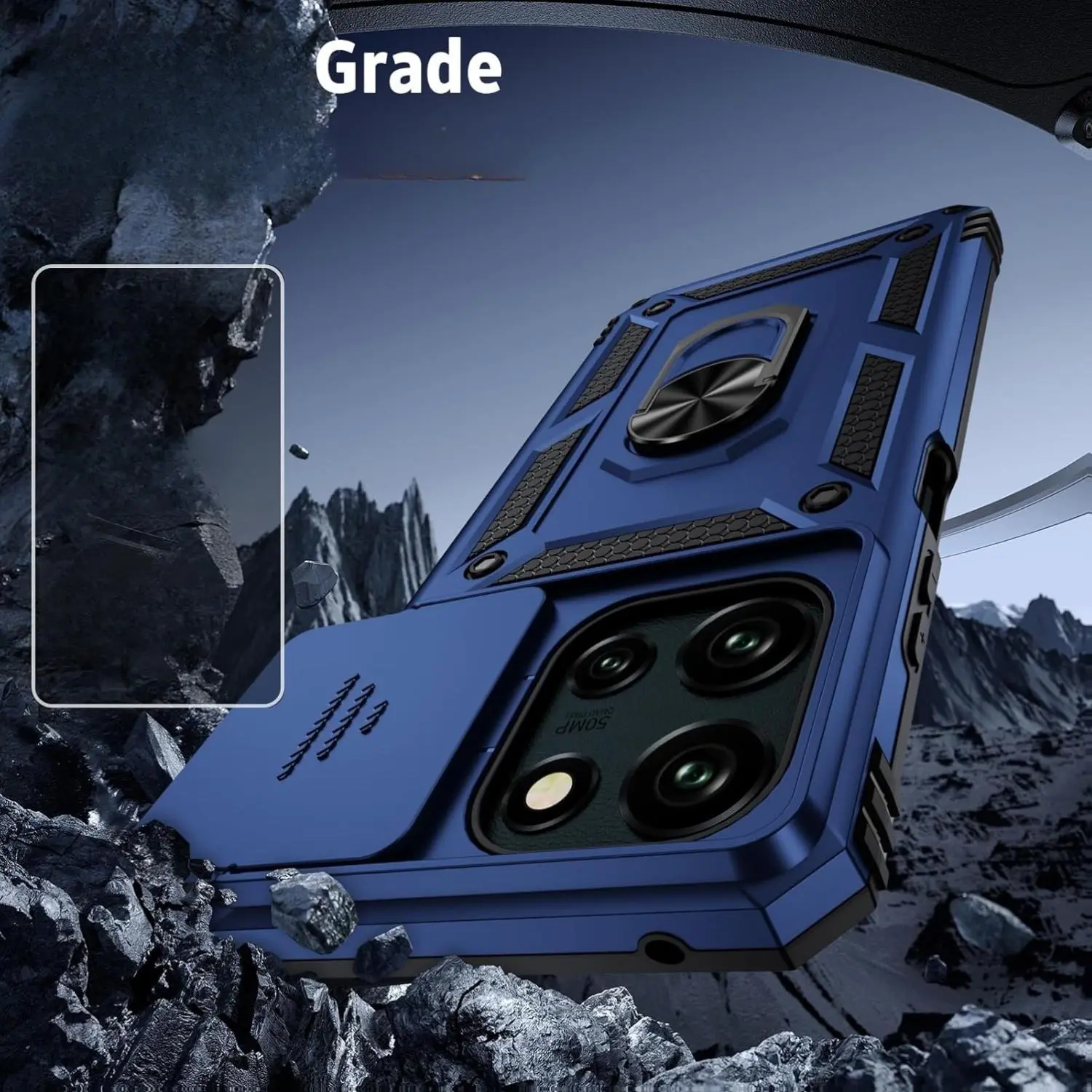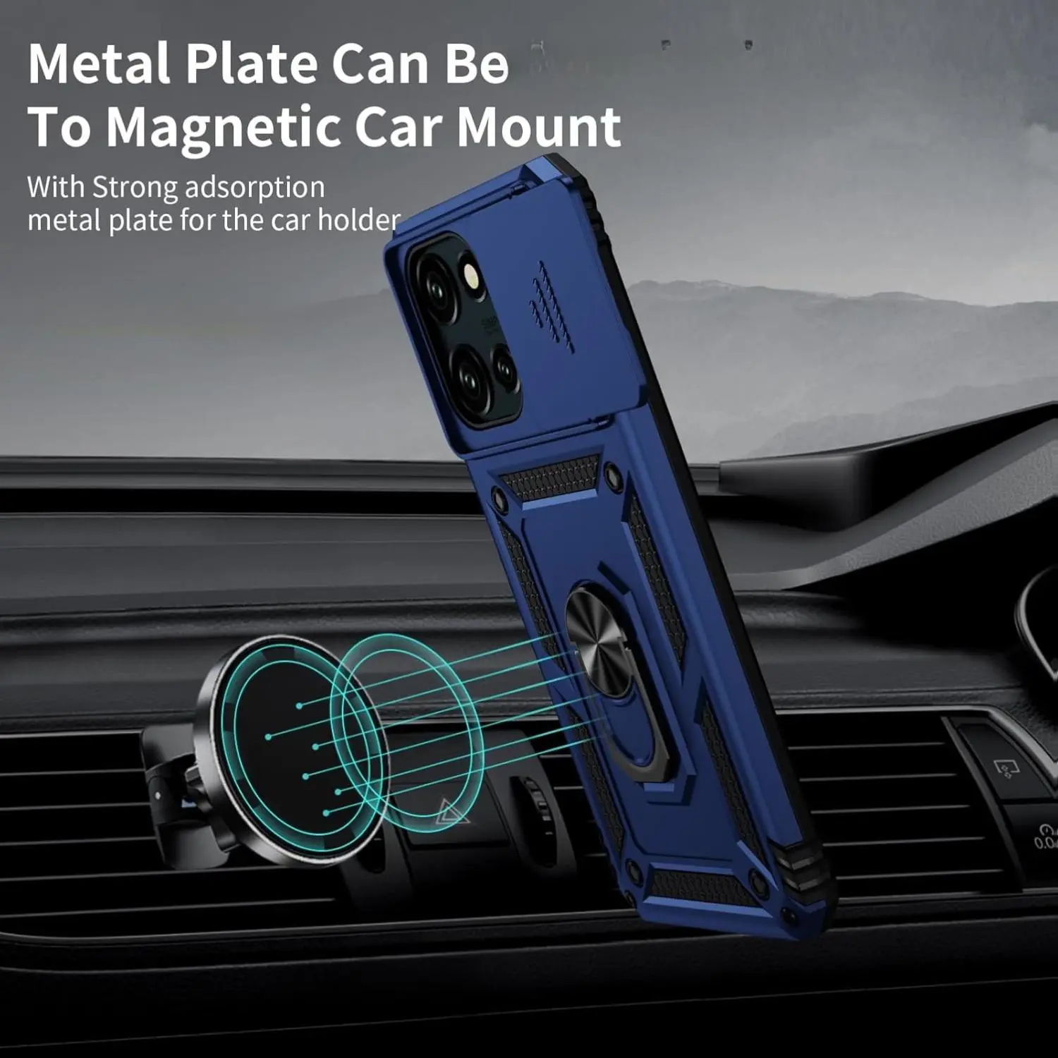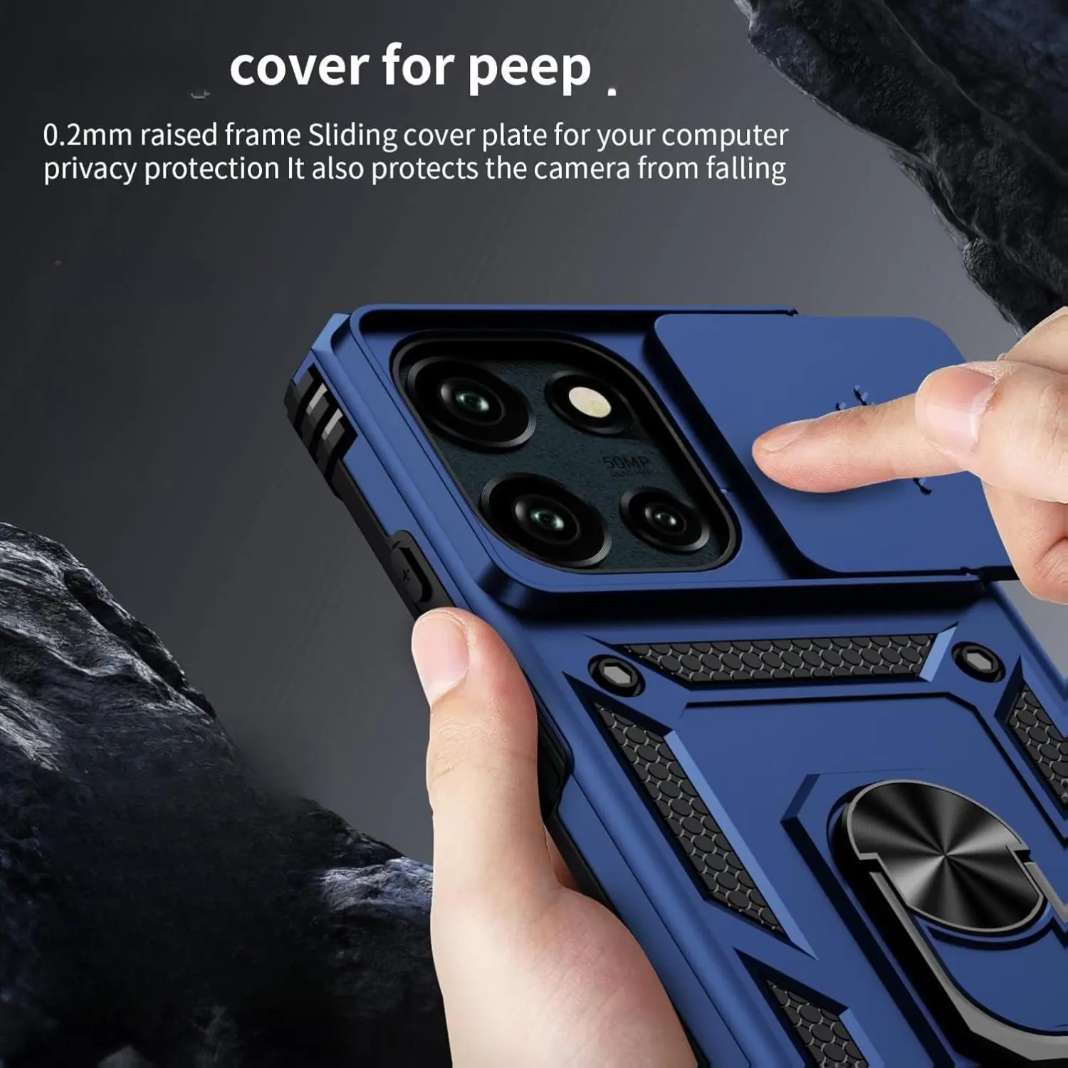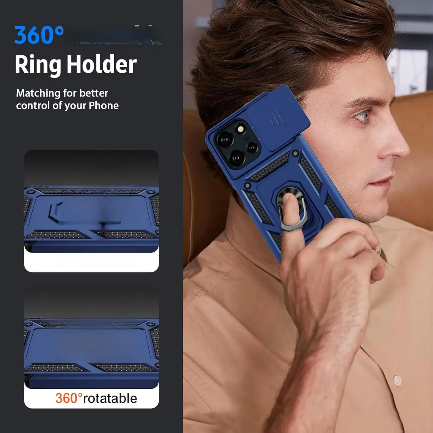 Armor case with sliding camera cover for Moto G Power 2025. Precise cutout design ensures perfect alignment with buttons, camera, speakers, and ports. Easy access and comfortable pressing. Note: Metal ring on the back renders it incompatible with wireless charging.
