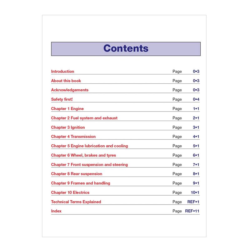 Chapters progress in a logical, easy‑to‑follow structure, starting with full‑color explanations of two‑stroke and four‑stroke combustion cycles, induction methods, and engine layouts. You’ll then explore fueling and ignition control, lubrication and cooling systems, clutches and gearboxes, final drive types, braking systems, wheel and tire construction, suspension, steering, and frame design. Electrical system basics and modern components are also clearly detailed.