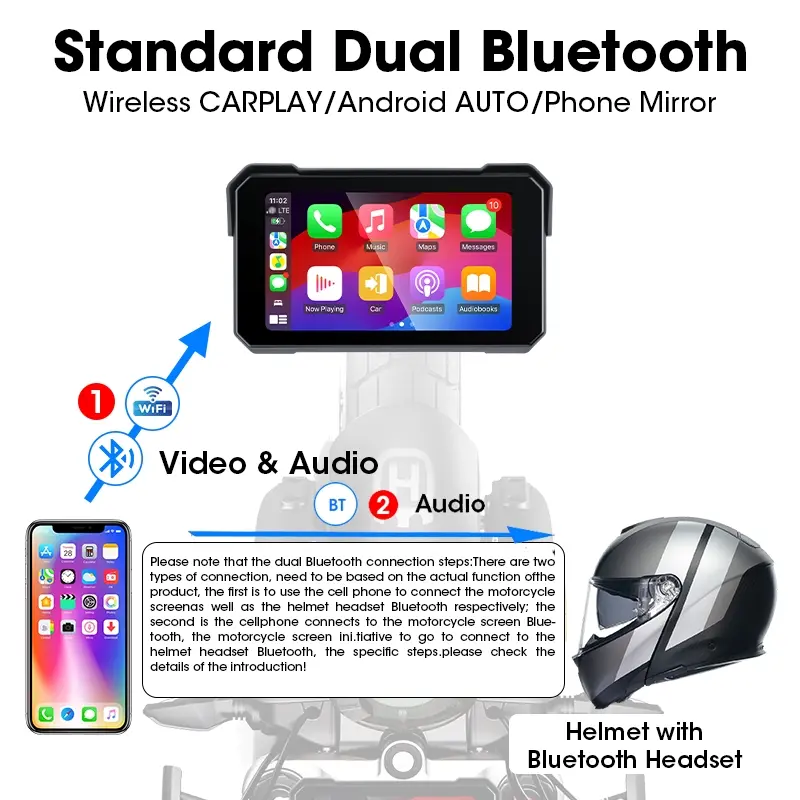 [Wireless Carplay &Android Auto & Mirror Link ] Motorcycle GPS radio supports wireless and wired carpaly& Android Auto, which supports you to sync most of the software on your phone to the radio, including WhatsApp, Waze, TikTok, etc. And also supports voice control that you can access the map navigation with the help of Siri or Goo--gle Assistant, phone calls, music playback, text messaging and more. Free your hands so you can focus on the road and ride safely.