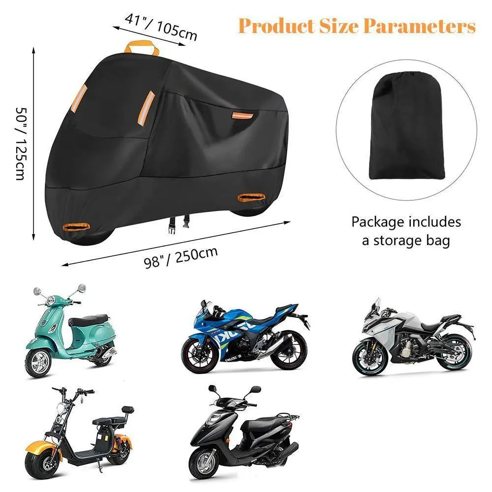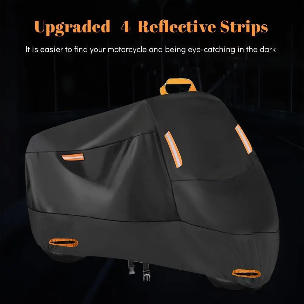 1.Our unique UV resistant, waterproof treated fabric cover protects against rain, wind, snow, sun, bird droppings, tree sap and dust, won't crack in cold weather, protects the motorbike from sun, rain and water damage.