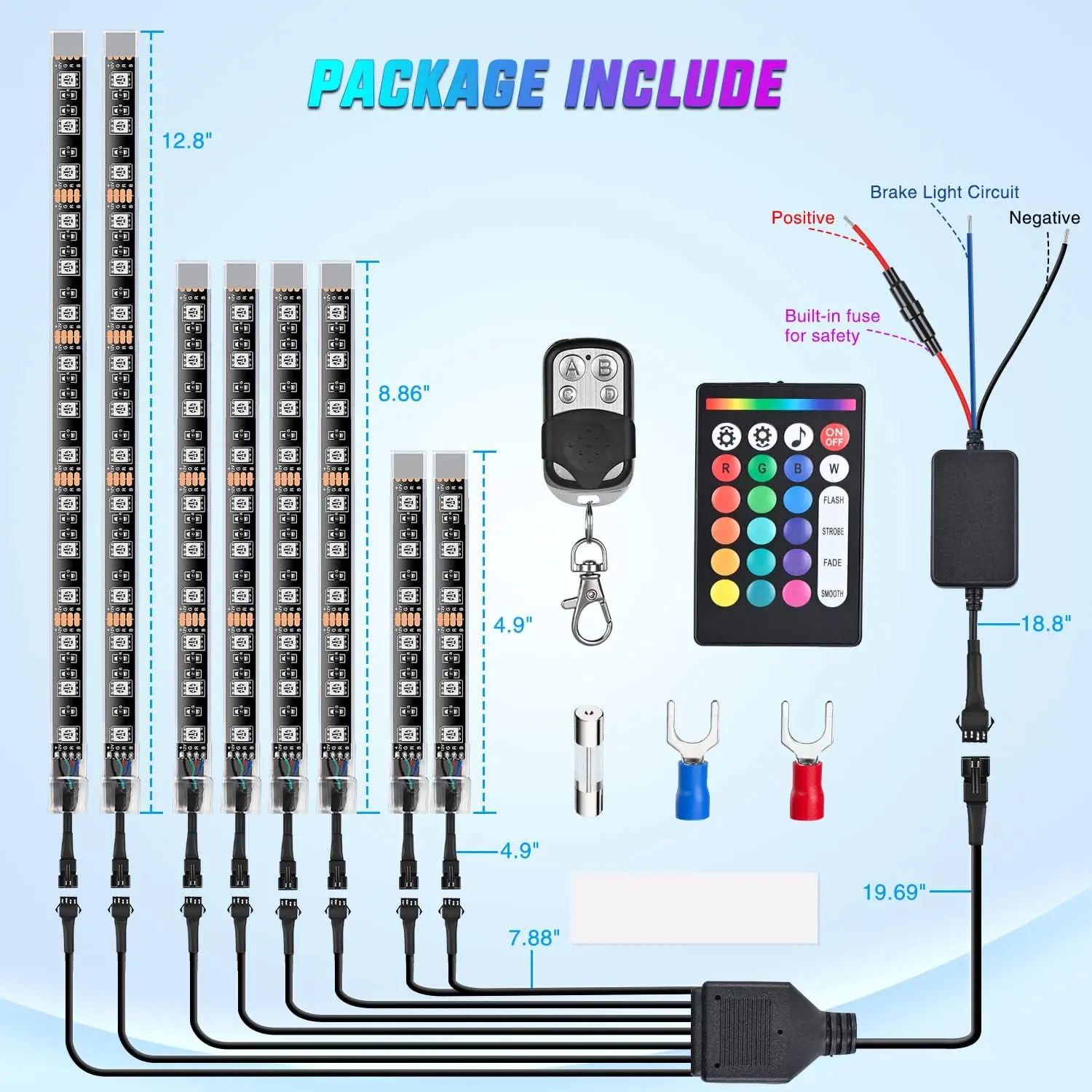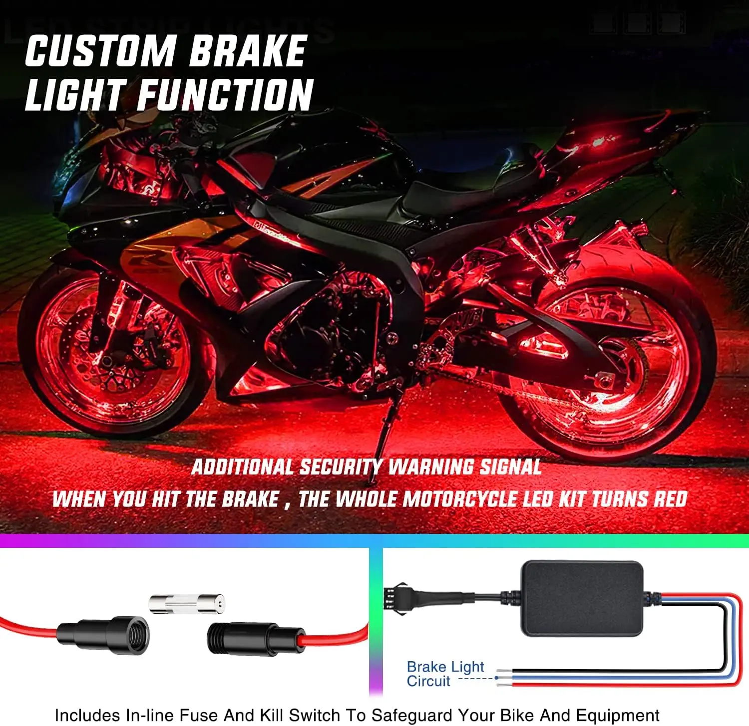 Featuring a brake light circuit that connects to the motorcycle battery. This means that when you brake, all the strip lights will turn red, give warning signals to other vehicles and reduce traffic accidents.